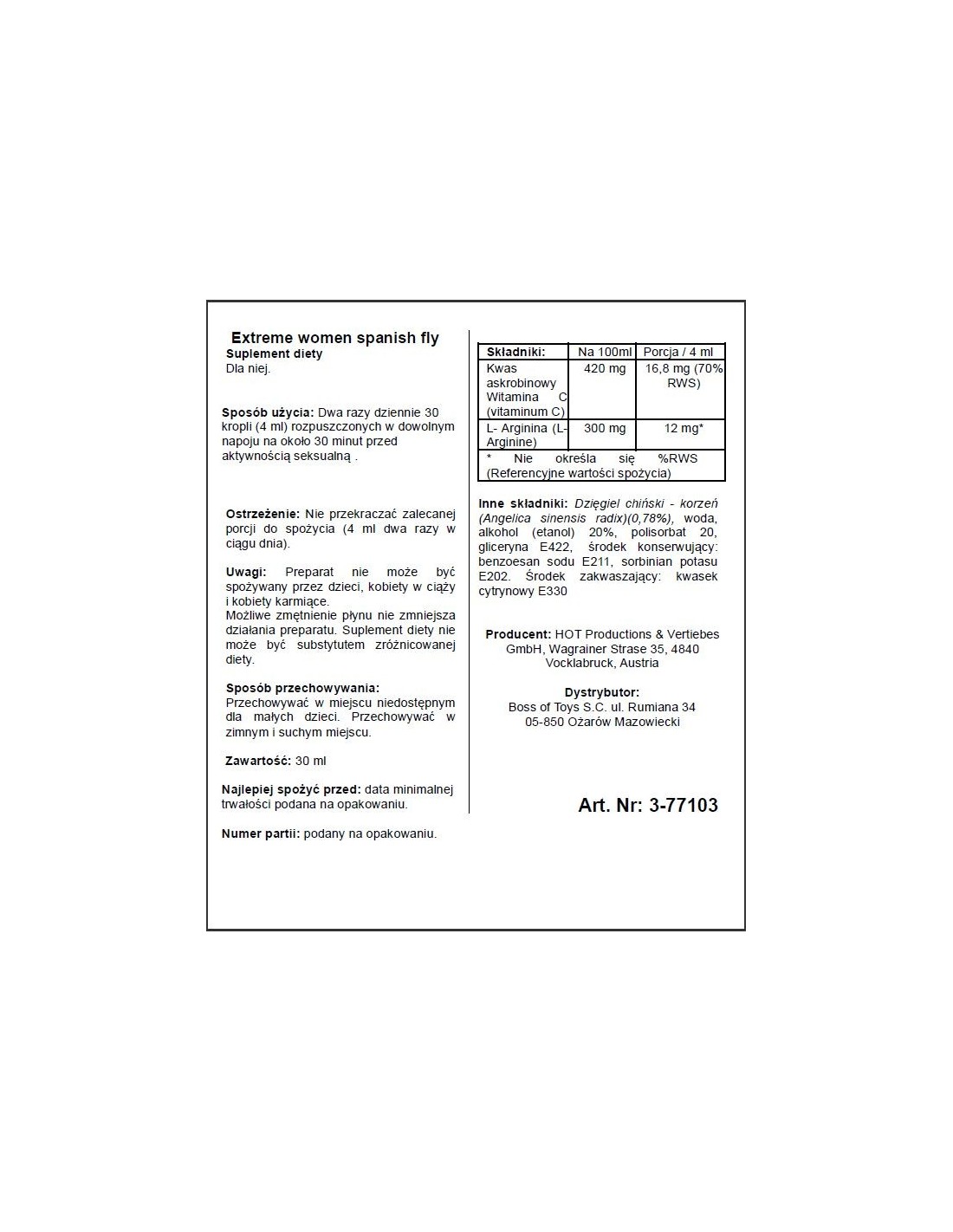 Hiszpańska mucha Spain Fly Extreme Women 30 ml to niezawodne wsparcie dla kobiet pragnących poprawić jakość swojego życia seksualnego. Dzięki składnikom o udowodnionym działaniu, ten suplement diety pozwoli Ci zwiększyć swoje libido, wzmocnić potencjał seksualny i osiągnąć orgazm szybciej i łatwiej. Nie czekaj dłużej - sięgnij po Hiszpańską muchę i odkryj nowe, niezapomniane doznania seksualne już dziś!
