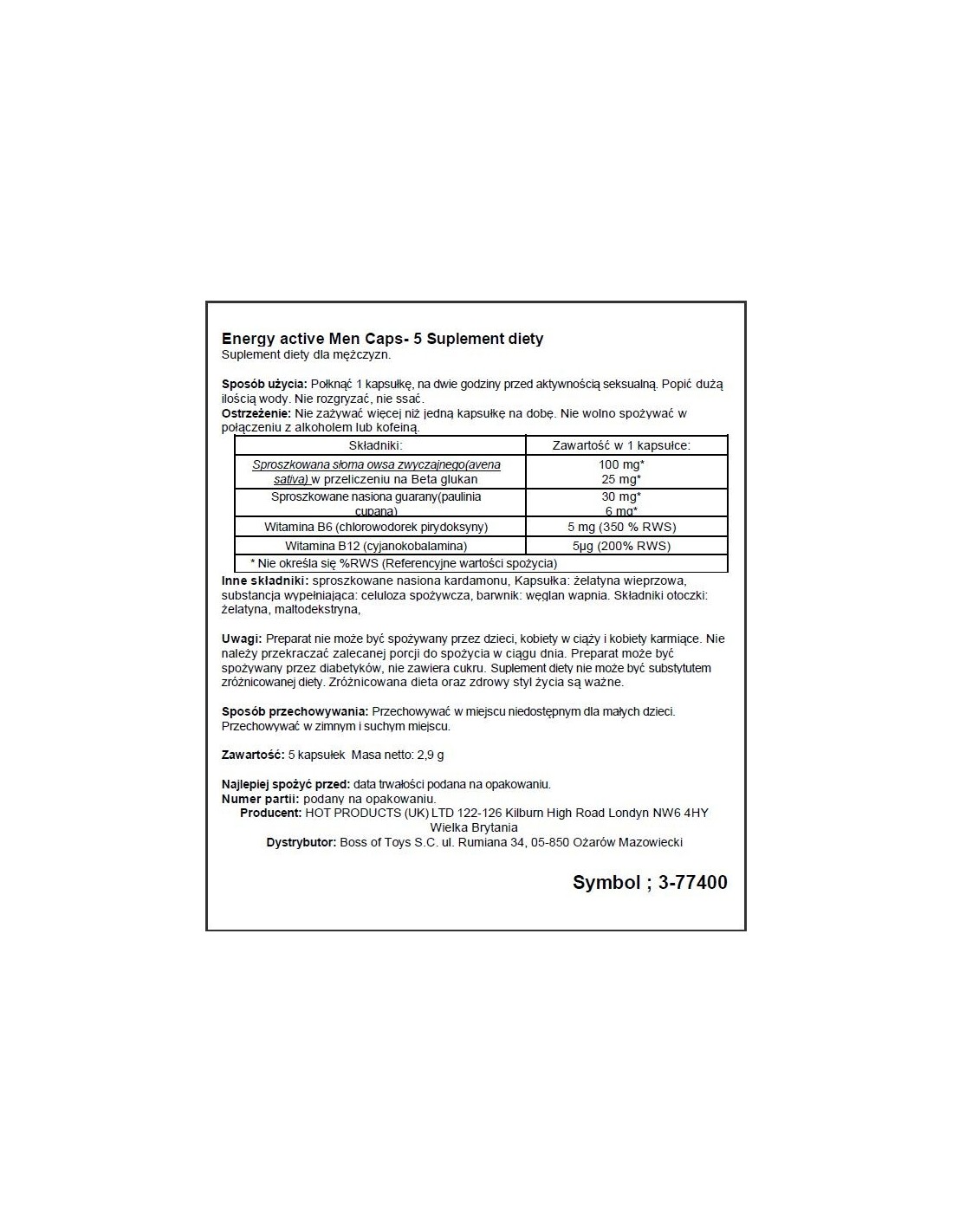 Men Energy 5 kaps. nie tylko poprawiają Twoją sprawność seksualną, ale także przywracają pewność siebie w intymnych związkach. Dzięki nim poczujesz się bardziej atrakcyjny i pożądany, co przełoży się na jeszcze lepsze doznania w łóżku. Nie trać czasu na wątpliwości - z Men Energy 5 kaps. zawsze będziesz gotowy do spełnienia swoich i partnerki najskrytszych pragnień.