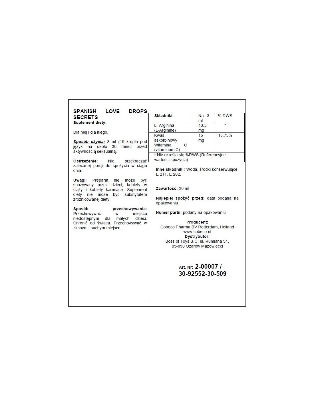 Spanish Love Drops Secrets to niezawodny suplement diety dla wszystkich, którzy pragną wzbogacić swoje życie intymne. Jego potężna koncentracja składników sprawia, że doznania stają się niezapomniane, a miłość staje się prawdziwą pasją. Nie czekaj - odkryj nieodkryte tajemnice i ciesz się namiętnymi chwilami już dziś!