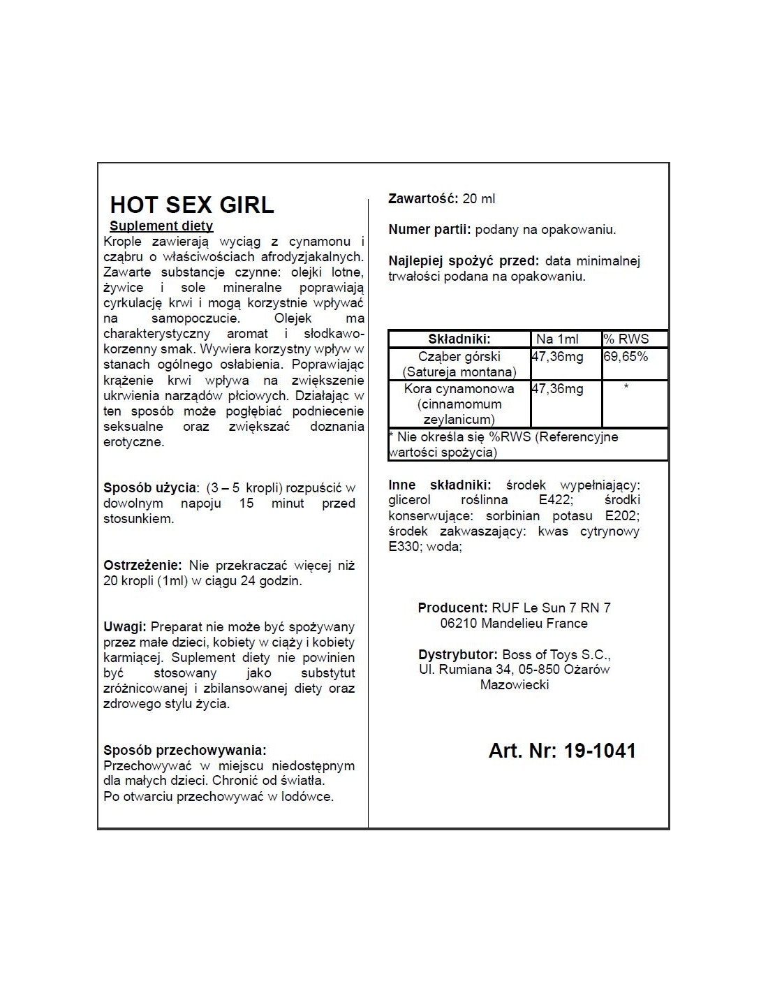 Dzięki Hot Sex Girl Twoje pożądanie zostanie wzmocnione, a doznania erotyczne będą jeszcze bardziej intensywne. Te krople można łączyć z różnymi napojami, a ich działanie nie zmieni smaku. Poczujesz, jak Twoje ciało staje się bardziej podatne na podniecenie, a Twoje narządy płciowe zostaną ukrwione, co przyczyni się do pogłębienia podniecenia seksualnego. Dodatkowo, ekstrakt z cząbru i cynamonu pobudzą Cię i poprawią Twoją kondycję fizyczną i psychiczną, abyś mógł cieszyć się jeszcze większą aktywnością orgazmów.
