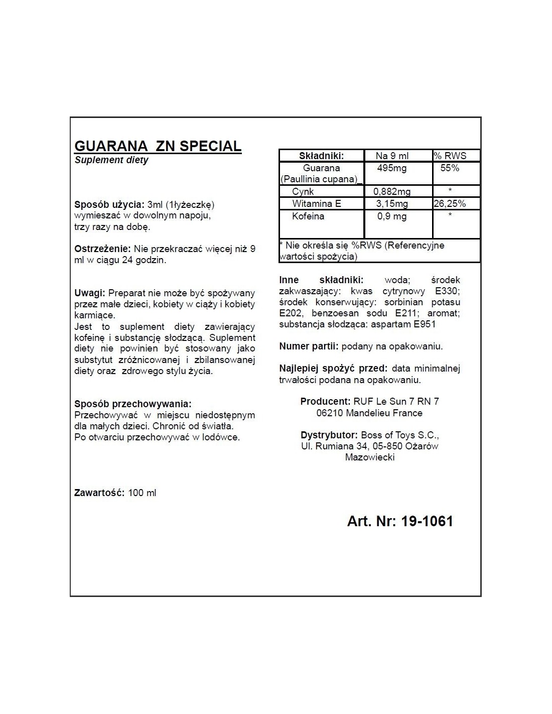 Guarana Zn 100 ml jest łatwy w użyciu. Wystarczy spożywać trzy łyżki dziennie, aby cieszyć się niewyczerpaną energią seksualną. Nie tylko poprawisz swoje doznania, ale także zyskasz pewność siebie i zaspokoisz swoje pragnienia.