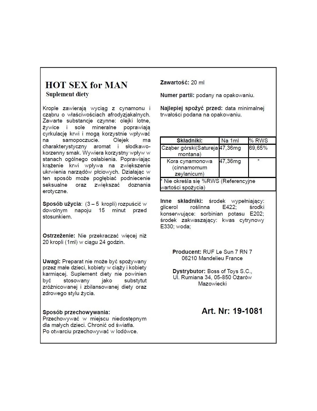 Hot Sex For Man to innowacyjny suplement diety w postaci płynu, który został stworzony specjalnie dla mężczyzn pragnących zwiększyć swoje libido i poprawić jakość swojego życia seksualnego. Dzięki unikalnej formule działania, ten suplement wpływa na cały organizm, skupiając się jednocześnie na poprawie ukrwienia w męskiej strefie genitalnej.