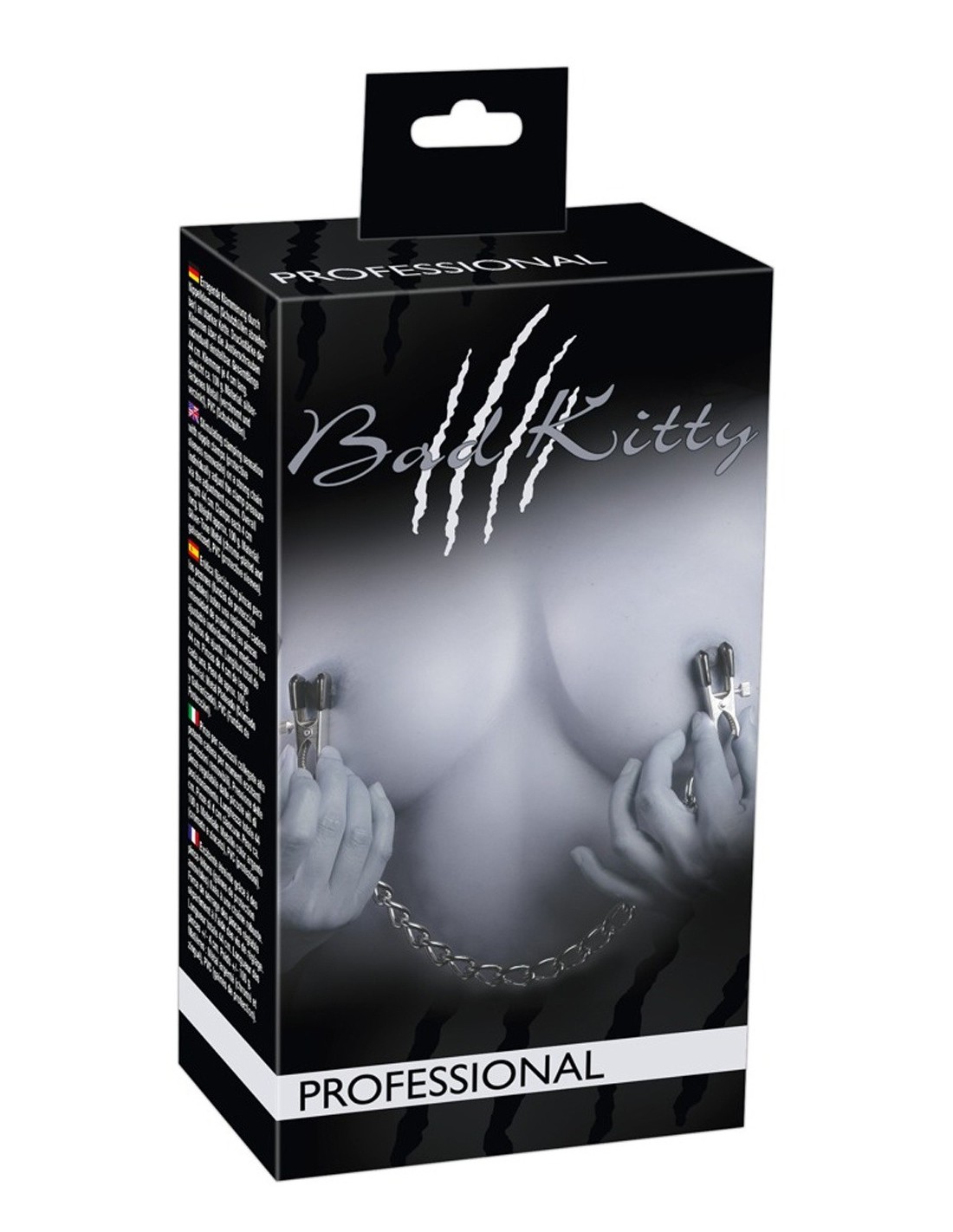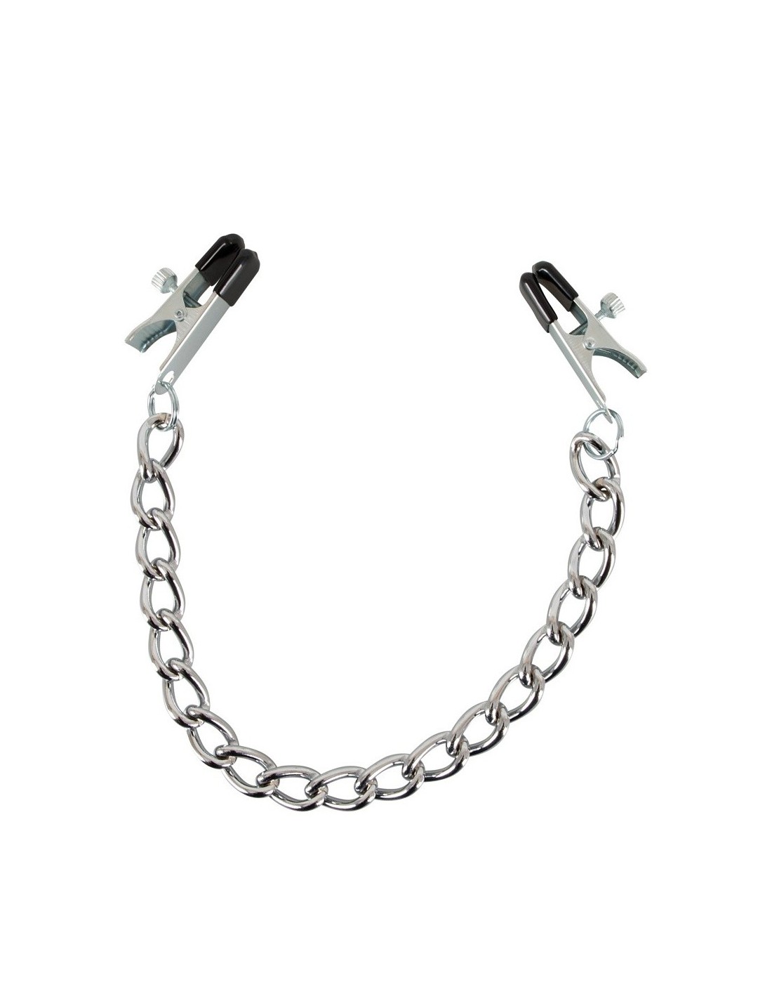 Zaciski na sutki (zdejmowane pokrowce ochronne) na mocnym łańcuchu. Natężenie ciśnienia zacisków jest regulowane oddzielnie za pomocą śrub. Całkowita długość 43,5 cm. Każdy zacisk o długości 2,3 cm. Waga ok. 100 gramów. Materiał: metal w kolorze srebrnym (chromowany i ocynkowany), PVC (osłony ochronne).