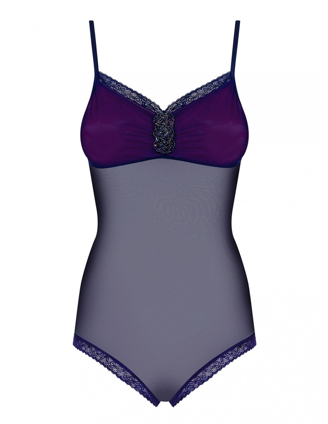 Body Suella to połączenie prześwitującej siateczki i koronkowej lamówki, które dodają mu niezwykłego wdzięku. Regulowane szelki gwarantują idealne dopasowanie, a podwójny materiał na biuście w przyciągającym wzroku fiolecie podkreśla Twoje piersi. Dodatkowo, urocza plecionka z koralików między miseczkami dodaje całości jeszcze więcej uroku.