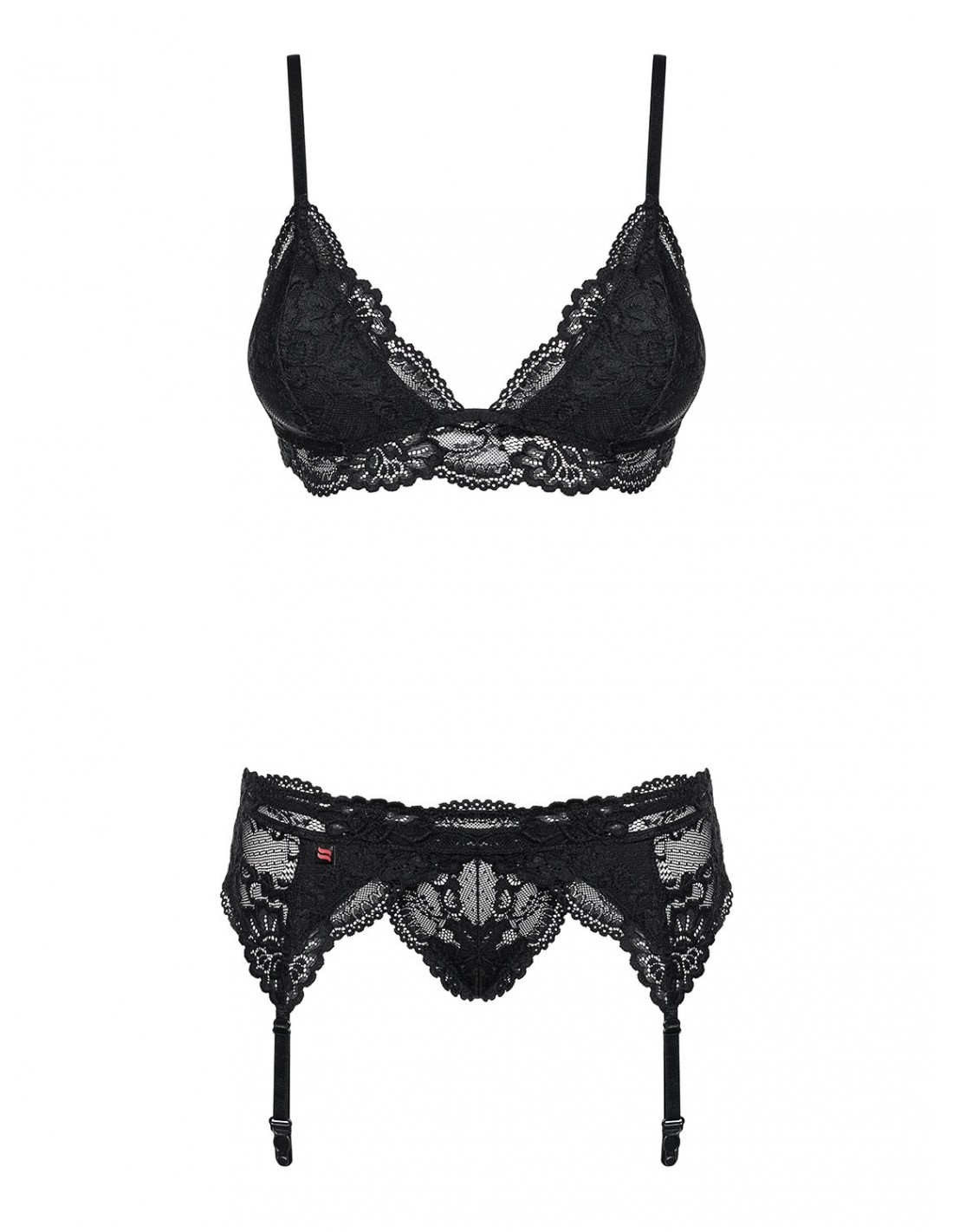Czarna koronka, seksowne zdobienia i rewelacyjny krój - ten komplet bielizny erotycznej to przepis na udany wieczór pełen rozkoszy i pikanterii. Nie potrzebujesz specjalnych umiejętności kulinarnych, aby wszystko wyszło doskonale. Po prostu załóż ten komplet i poczuj się niezwykle seksownie.