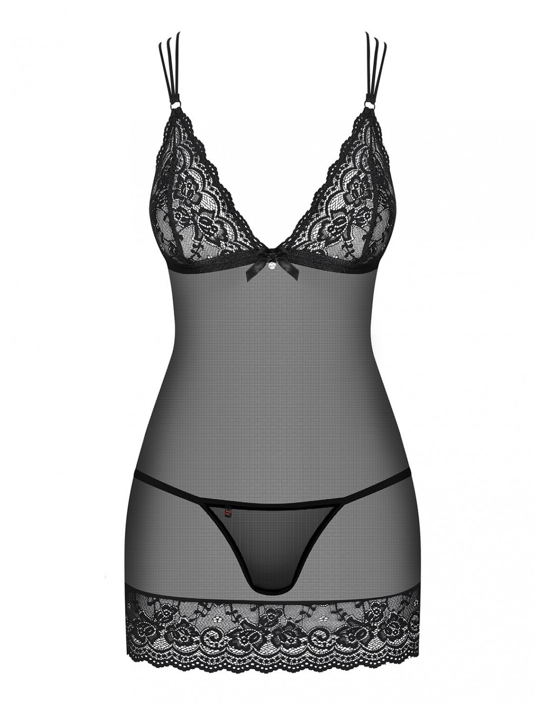 Prześliczne ramiączka w postaci elastycznych gumeczków krzyżują się na plecach, dodając seksownego akcentu. Miękkie, koronkowe miseczki pięknie ozdobią Twoje piersi, a błyszczący kryształek i satynowa kokardka pod biustem przyciągną wzrok każdego obserwatora. Dodatkowo, powabne wycięcie na plecach i dół koszulki wykończony koronką sprawiają, że ten zestaw jest niezwykle atrakcyjny i elegancki.