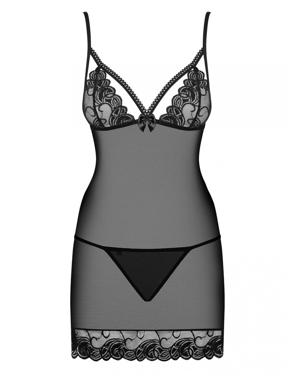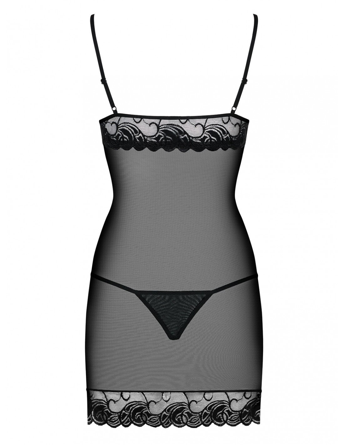 Dół i tył koszulki są wykończone koronką, która dodaje Ci dodatkowego kobiecego wdzięku. W komplecie znajdują się również stringi uszyte z delikatnej siateczki, które idealnie komponują się z koszulką. Materiał, z którego została wykonana bielizna (90% poliamid, 10% elastan), jest nie tylko przyjemny w dotyku, ale także elastyczny, co gwarantuje maksymalny komfort noszenia.