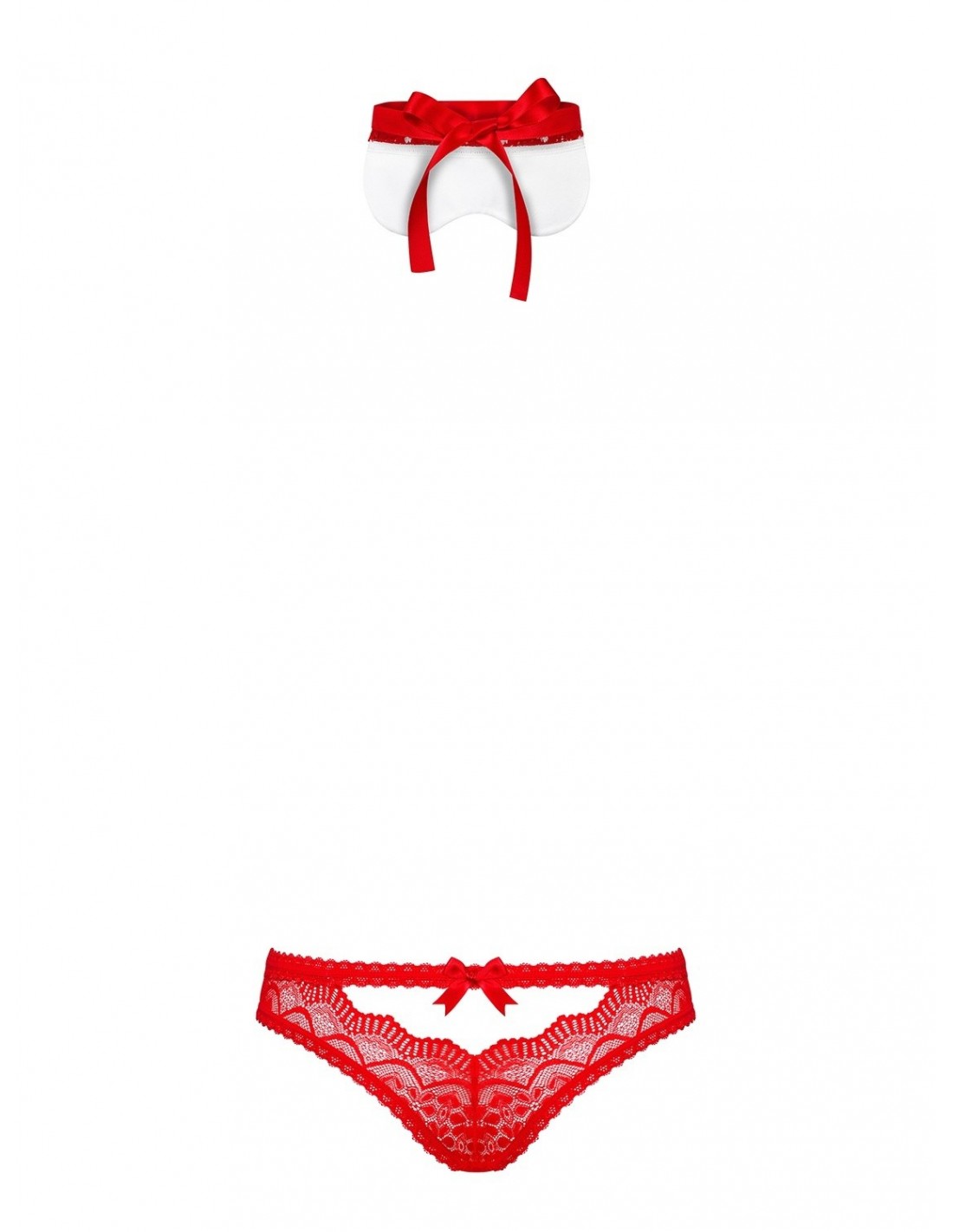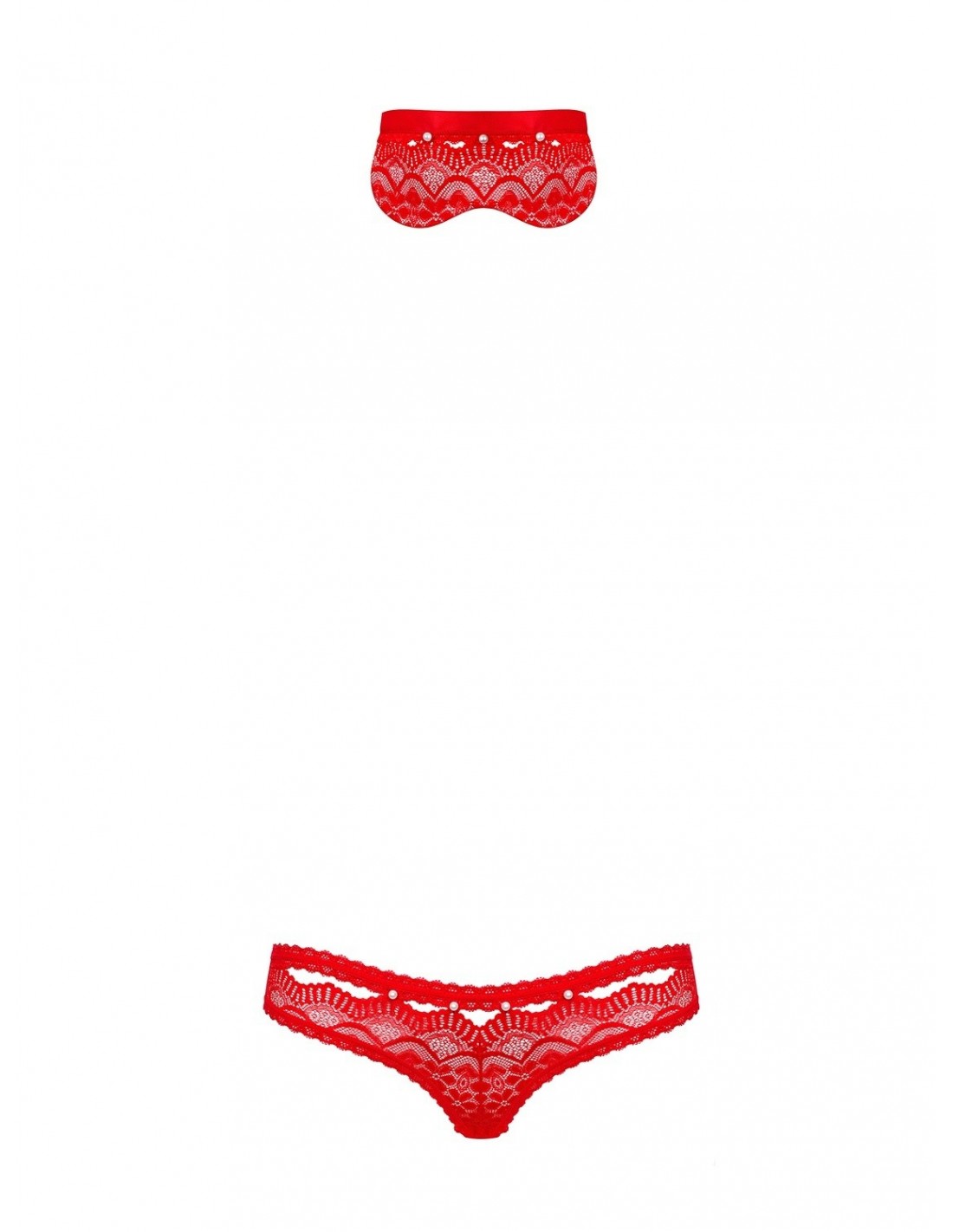 Ten gorący, koronkowy komplet to nie tylko bielizna, to prawdziwy zestaw do zadań specjalnych. Zawiera maskę na oczy, która dodaje tajemniczości i podkręca atmosferę, oraz frywolne majteczki, które podkreślają Twoje kształty i dodają seksapilu.
