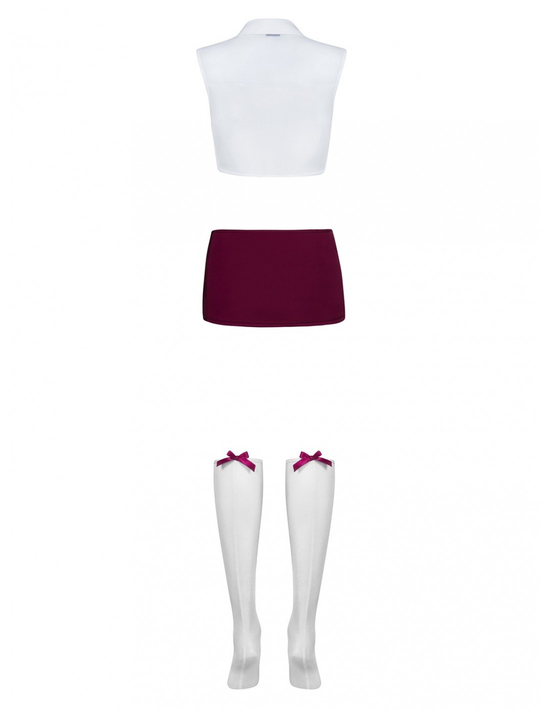 Ten czteroczęściowy strój uczennicy to prawdziwy hit! Zaczynamy od krótkiego, białego topu, który możesz wiązać pod szyją. To idealne uzupełnienie do bordowej mini-spódniczki, która podkreśla Twoje kobiece kształty. Ale to nie wszystko - perfekcyjne detale, takie jak bordowa wstążeczka i fikuśne kokardki, dodają temu kostiumowi niepowtarzalnego uroku.
