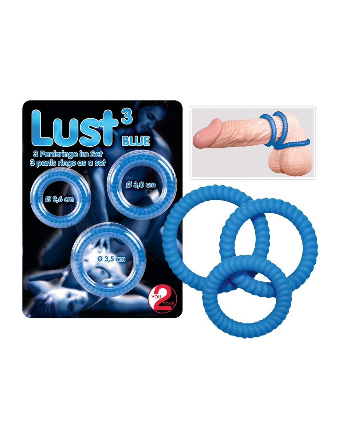 3 rowkowane pierścienie o różnych średnicach (2,6, 3,0 i 3,5 cm). Nadają się również na jądra.