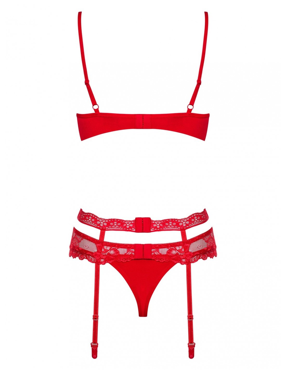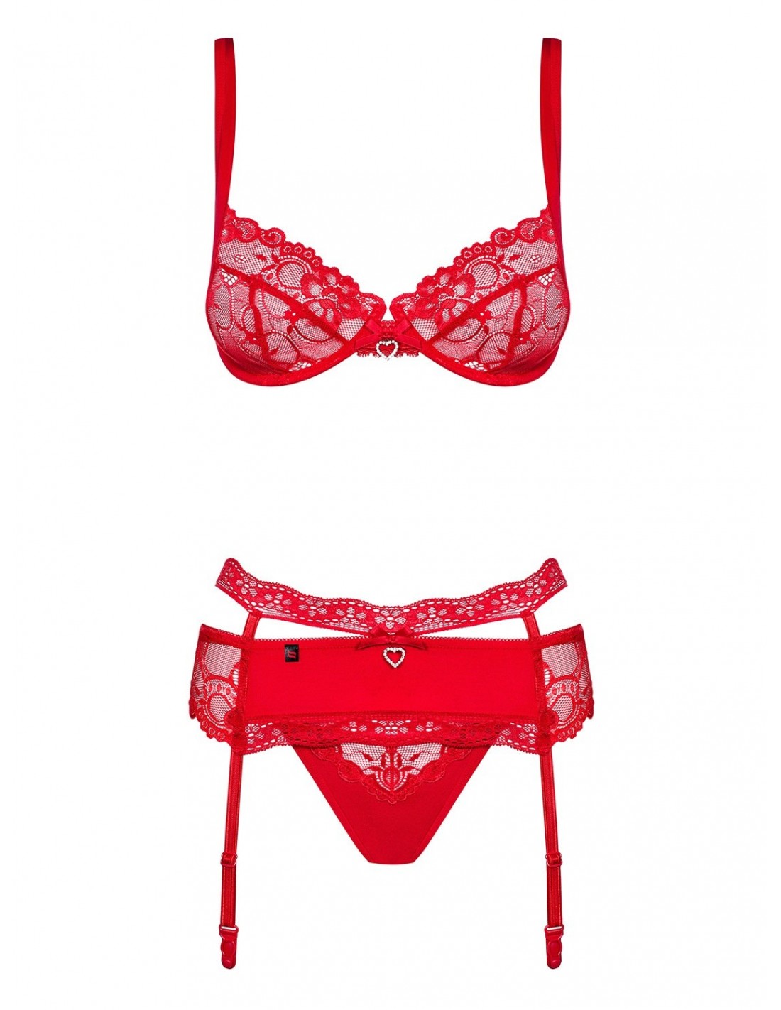 Komplet Bielizny Heartina zawiera również wyjątkowo zdobiony pas do pończoch, który dodaje zjawiskowego wyglądu. Pas posiada dodatkowy pasek koronki i dwa regulowane zapięcia, zapewniając idealne dopasowanie. W komplecie znajdziesz również pasujące do całości stringi, które dodają jeszcze większej atrakcyjności.