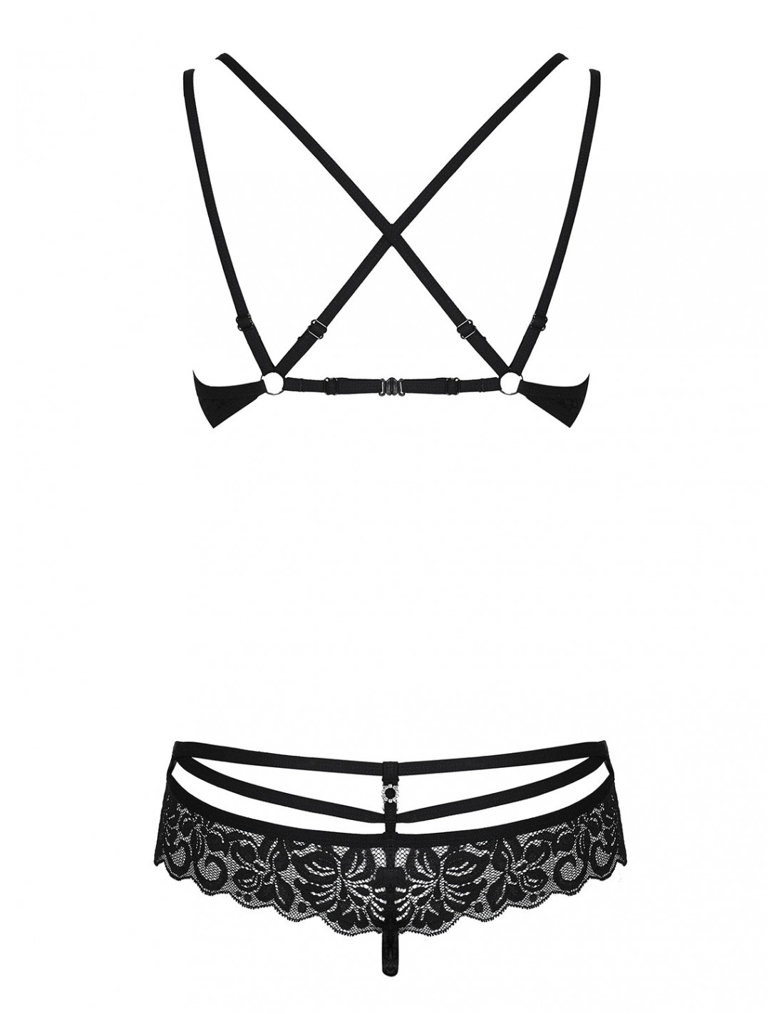 Czy marzysz o niezwykle seksownym i uwodzicielskim wyglądzie? Ten komplet bielizny erotycznej spełni Twoje najskrytsze fantazje! Wysmakowana czerń, piękna koronka, intrygujące paseczki i błyszczące detale sprawią, że poczujesz się niezwykle atrakcyjna i pewna siebie.