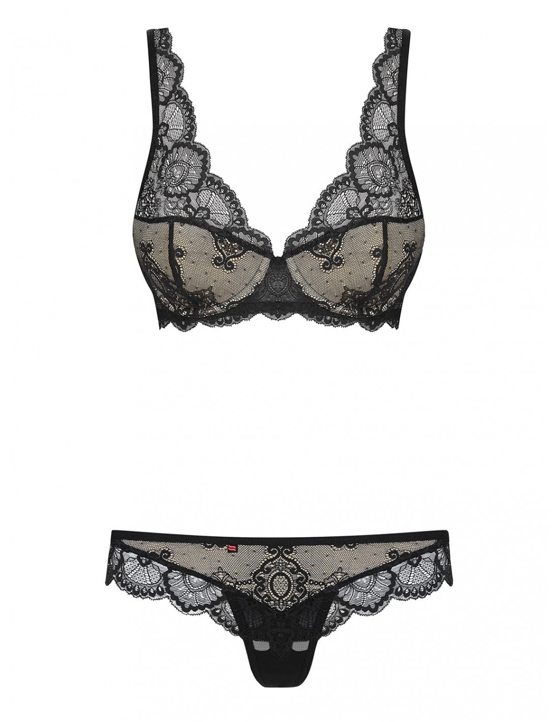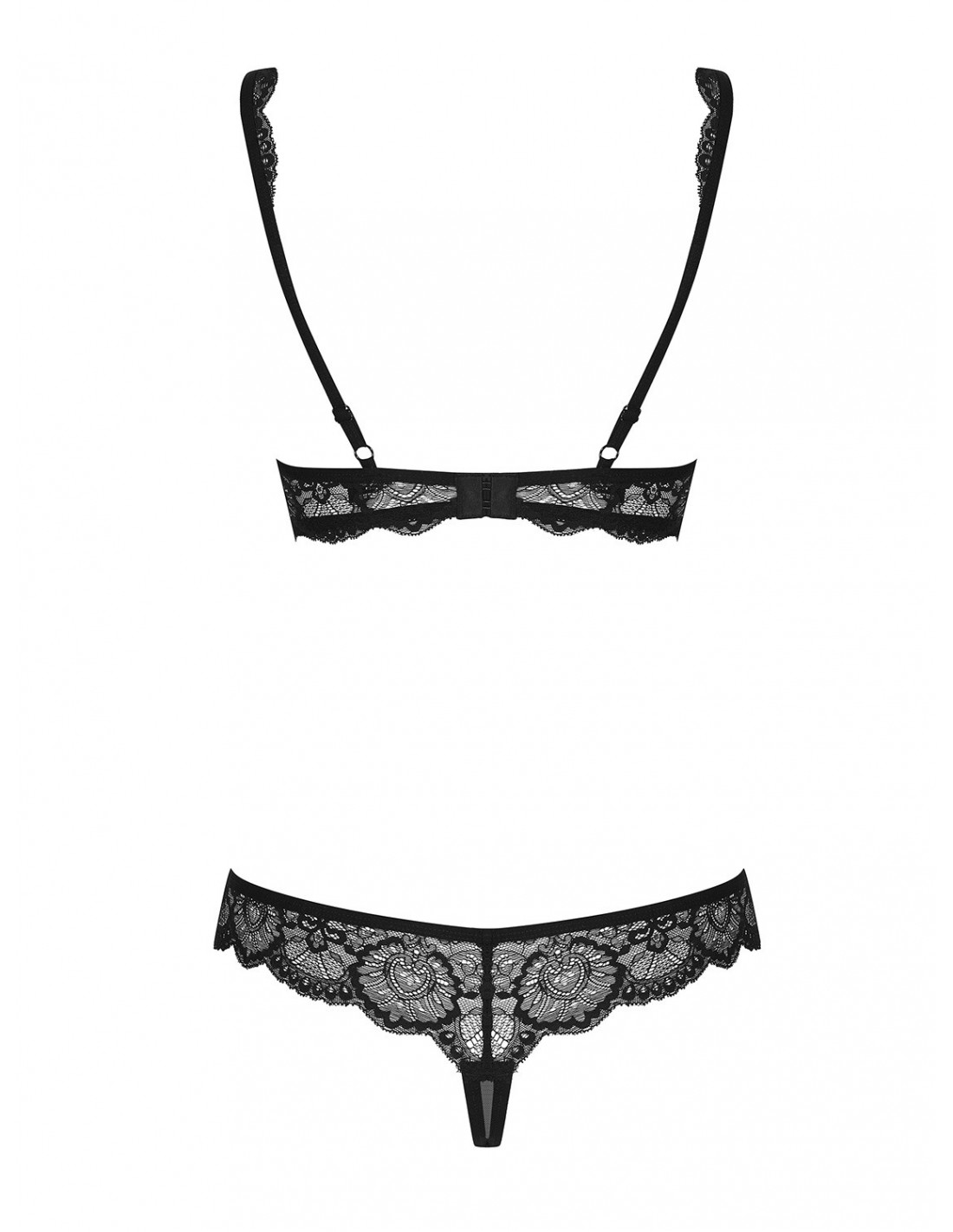 Ten komplet bielizny to nie tylko zwykłe majteczki i biustonosz. Z tyłu znajdziesz możliwość regulacji szelek i zapięcia, które pozwolą Ci dopasować strój do swojej figury. Miseczki są podszyte beżową tkaniną, co dodaje im nieziemskiego wyglądu. Koronka poniżej miseczek podkreśla piękno i linie Twojego biustu. A co z tyłu? Szeroka koronka, która dodaje całości jeszcze więcej uroku.