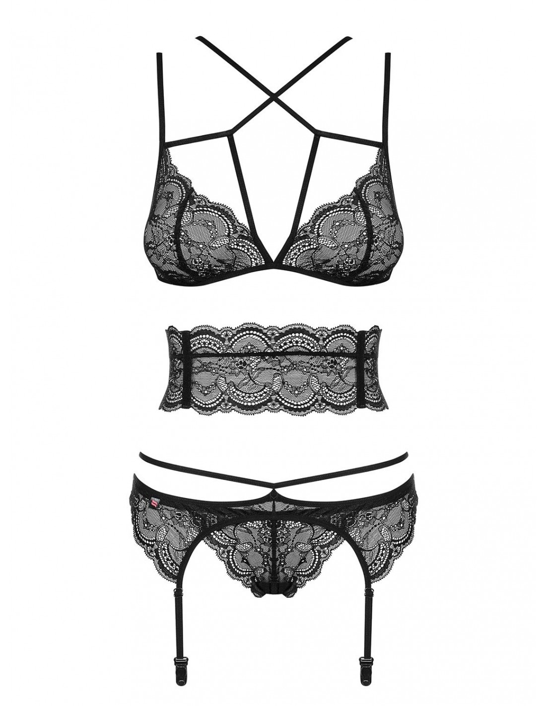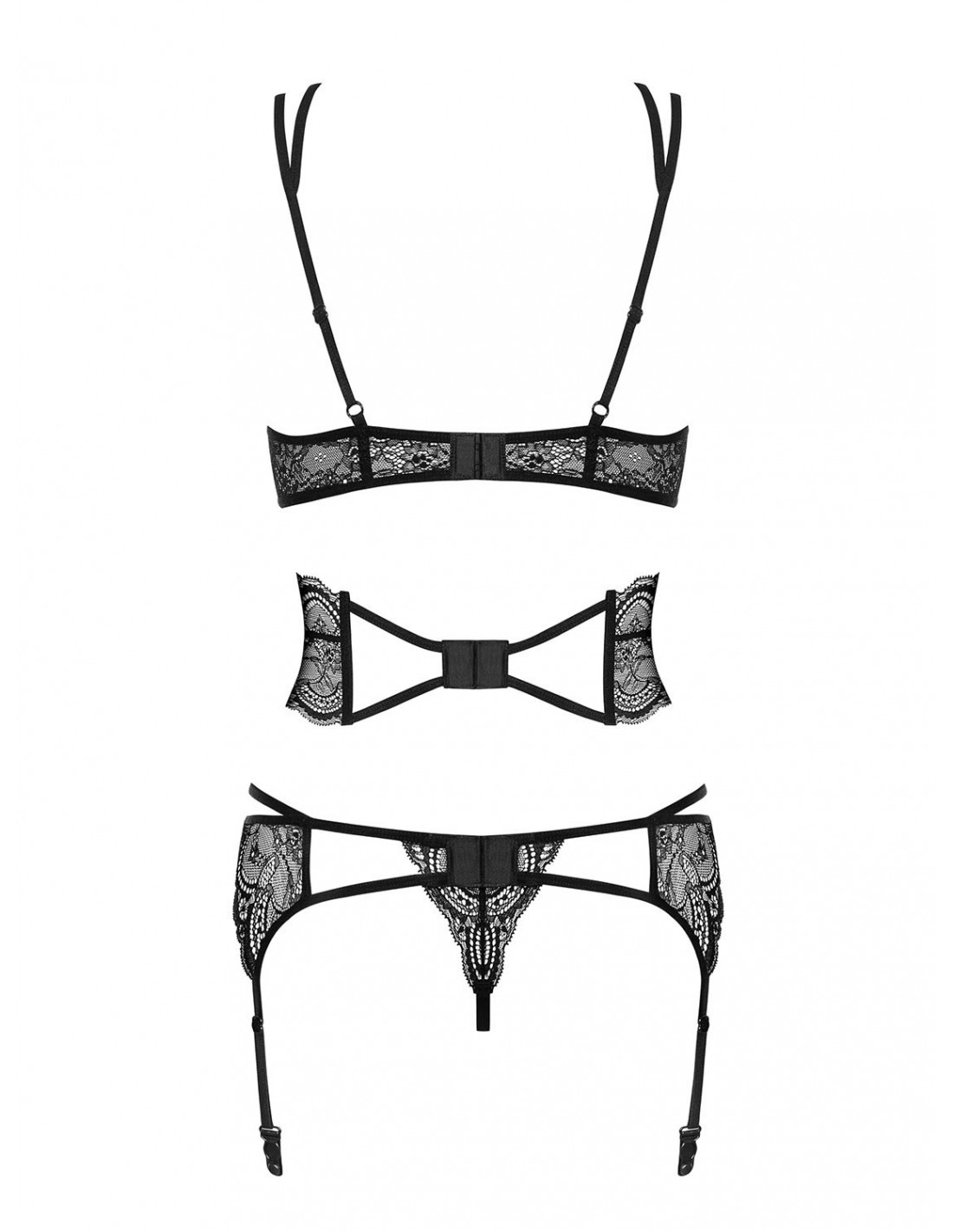 W komplecie otrzymujesz również regulowany pas do pończoch, który pozwoli Ci stworzyć jeszcze bardziej uwodzicielski look. Dodaj do niego swoje ulubione pończochy i gotowe! Całość dopełniają koronkowe stringi, które są nie tylko seksowne, ale również miłe w dotyku dzięki elastycznemu materiałowi, z którego zostały wykonane (90% poliamid, 10% elastan).