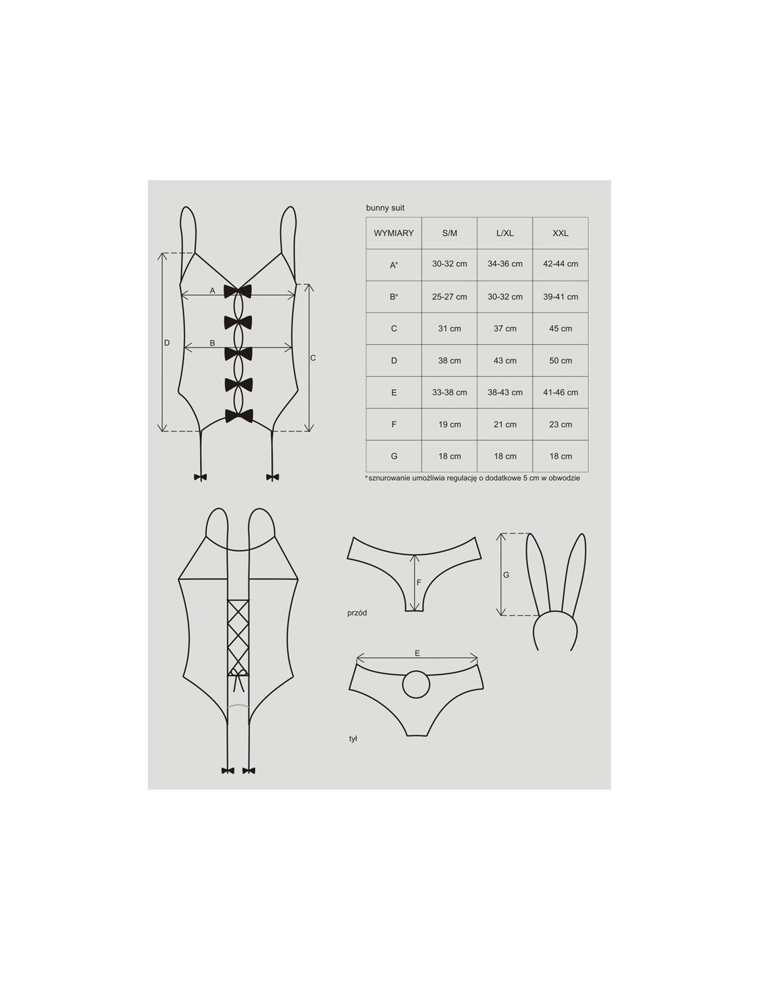 W komplecie z tym uroczym kostiumem otrzymasz wszystko, czego potrzebujesz, aby stworzyć niezapomnianą atmosferę. Oprócz gorsetu, otrzymasz również seksowne majteczki z uroczym ogonkiem, które dodają całości jeszcze większego uroku. Dodatkowo, w zestawie znajdziesz również urocze uszka i pończochy, które dopełnią Twój wyjątkowy wygląd.