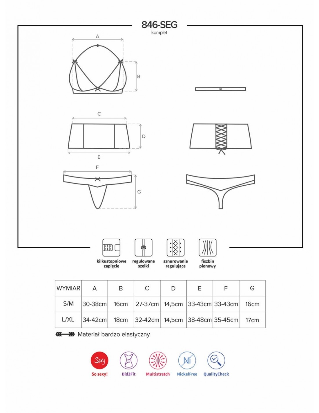 Wykonany z delikatnych w dotyku, elastycznych materiałów (90% poliamid, 10% elastan), ten komplet bielizny zapewni Ci nie tylko komfort noszenia, ale również wyjątkowe doznania podczas bliskich chwil z ukochanym. Materiały są przyjemne dla skóry i nie powodują uczuleń, dzięki czemu możesz cieszyć się pełnym relaksem i rozkoszą.
