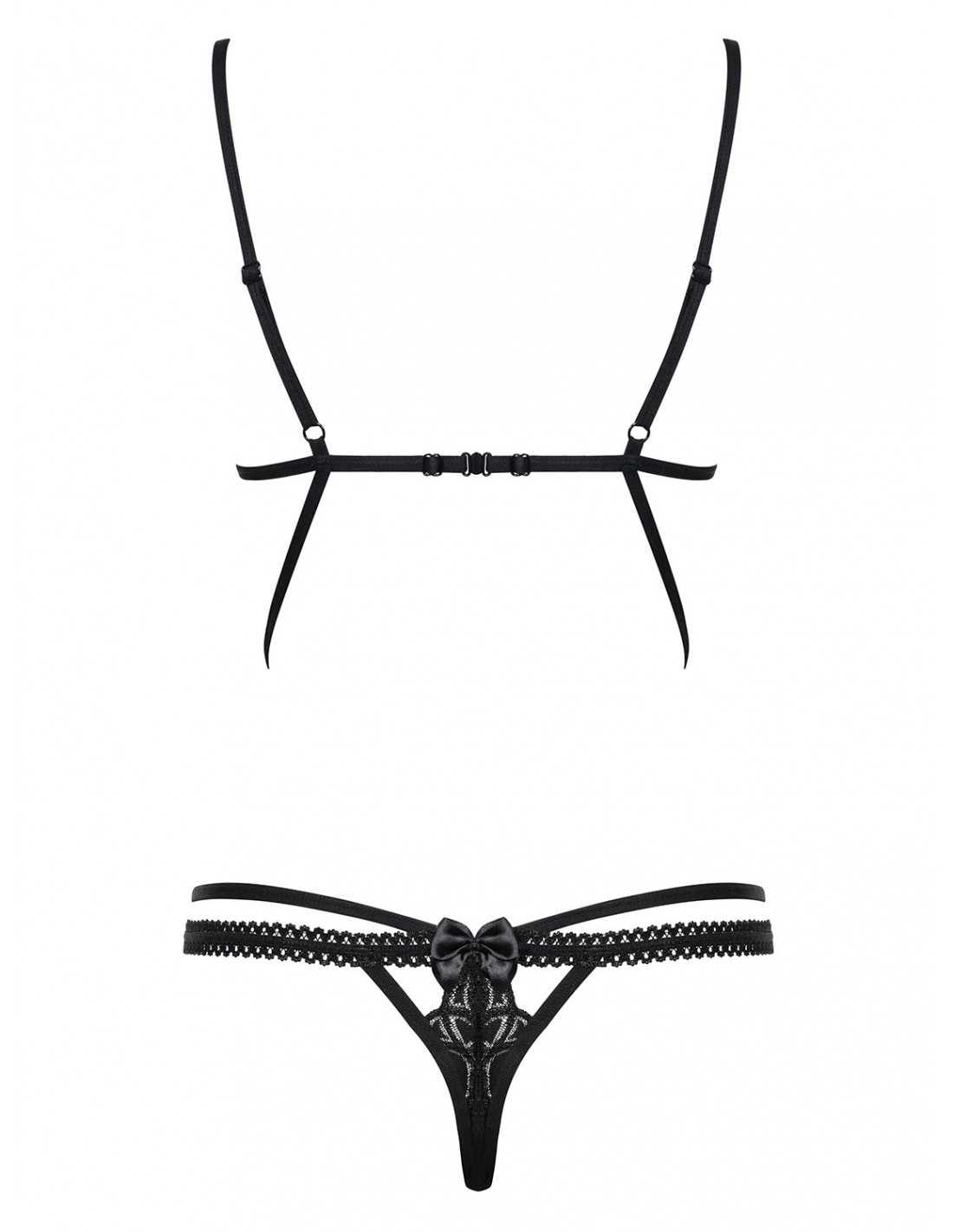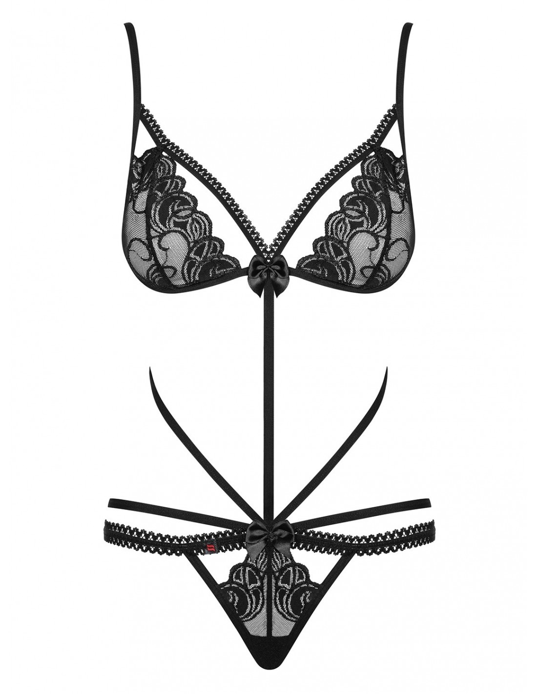 Ten seksowny strój wykonany jest z pięknej koronki i elastycznych paseczków, które idealnie dopasowują się do Twojej sylwetki. Regulowane ramiączka zapewniają pełen komfort noszenia, a subtelny, koronkowy biustonosz w uroczym fasonie podkreśla kształty Twojego biustu. Dekolt zdobiony koronkowymi paseczkami dodaje niezwykłej ponętności, a kusząca kokardka pomiędzy miseczkami, pod brzuszkiem i nad pośladkami to kokieteryjne detale, które rozpalą Waszą namiętność.