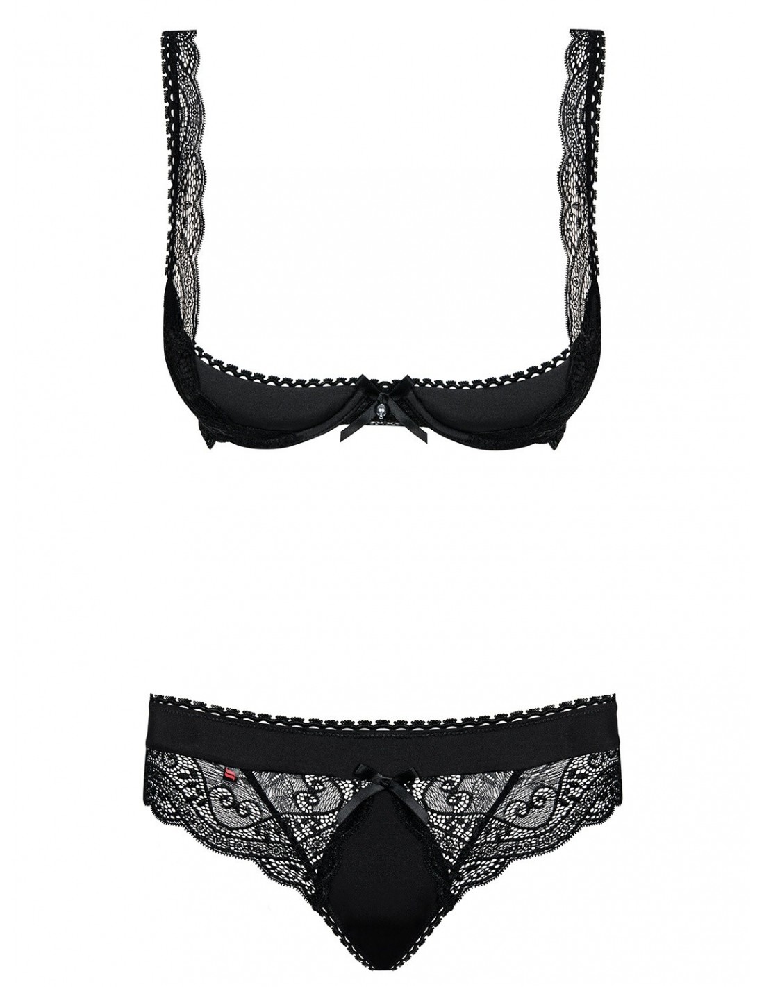 Kuszący dwuczęściowy komplecik z koronkowymi zdobieniami to esencja zmysłowości. Półbiustonosz odważnie odsłania biust, a usztywniane miseczki z wkładkami push-up gwarantują idealne uniesienie. Dodatkowo, satynowa kokardka dodaje uroku, podkreślając Twoją kobiecą naturę.