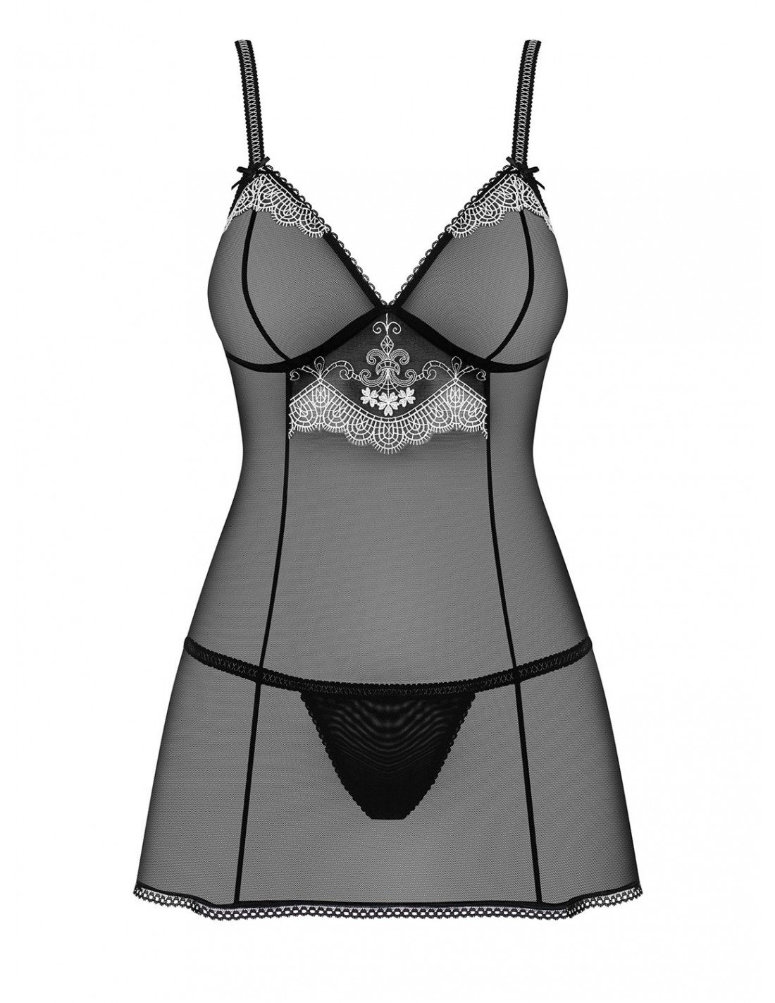 Ten babydoll i stringi to nie tylko seksowna koszulka z delikatnej siateczki. To również miękkie miseczki, które ozdobione są białymi haftami i delikatną lamówką. Regulowane ramiączka zapewniają perfekcyjne dopasowanie, a eleganckie, gipiurowo-haftowane zdobienia pod biustem dodają całości jeszcze więcej uroku.
