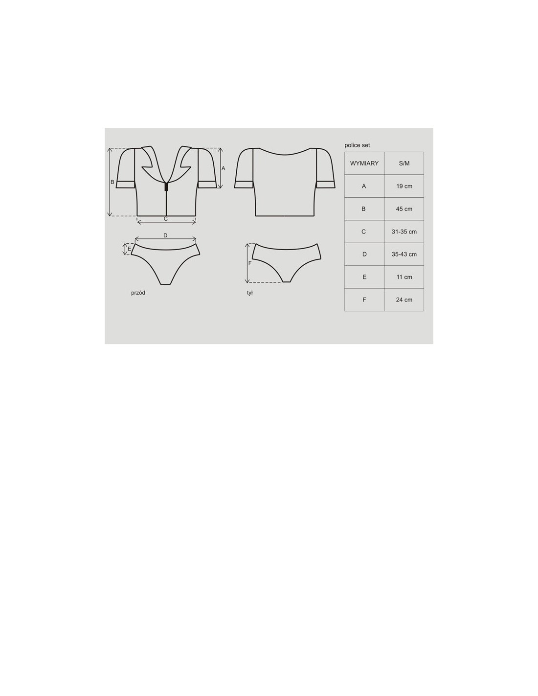Ten szcześcioczęściowy komplet to prawdziwa gratka dla miłośniczek erotycznych przebrań. Bluzeczka wykonana z wysokiej jakości materiału posiada vinylowe dodatki, takie jak kołnierzyk, mankiety i kieszonkę na piersi. Dodatkowo, na prawym ramieniu i nad lewą piersią znajdują się plakietki z napisem "Police", które dodają całości niepowtarzalnego charakteru. Bluzeczka jest również zapinana na zamek, co pozwala na łatwe i szybkie ubranie i rozebranie się.