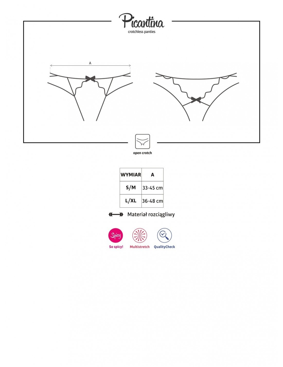 Zapomnij o nudnych i zwyczajnych stringach. Picantina to kuszące stringi w otwartym kroku, które dodadzą Twojej garderobie niezapomnianego uroku. Koronkowe aplikacje nadają im wyjątkowego charakteru, a kokardka na pośladkach jest czarującym detal, który zachwyci Twojego partnera.