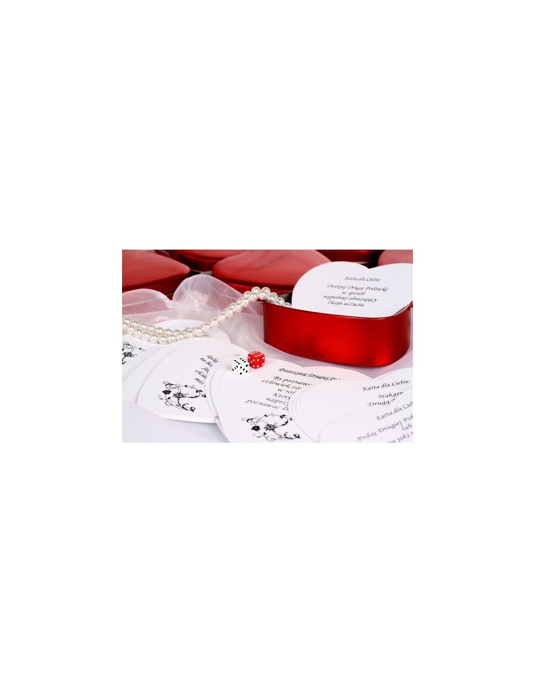 W zestawie znajdziecie pięknie zdobione metalowe pudełko, które skrywa w sobie nie tylko serce gry, ale także wasze najskrytsze marzenia. Dodatkowo, czekają na was dwie kostki i 54 karty w kształcie serc, które będą prowadzić was przez całą przygodę. Instrukcja w języku polskim pomoże wam rozpocząć grę od razu i cieszyć się chwilami pełnymi miłości i ekscytacji.