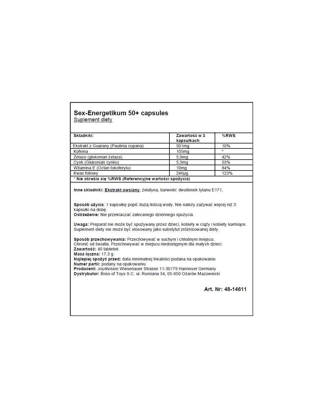 Przywróć sobie pewność siebie i ciesz się pełnią seksualności dzięki Seks-Energetikum Pokolenie 50 +. Ten innowacyjny produkt marki JoyDivision został stworzony specjalnie dla Ciebie, abyś mógł cieszyć się takim seksem jak dawniej. Nie trać więcej czasu na problemy z erekcją - sięgnij po Seks-Energetikum Pokolenie 50 + i odkryj nową jakość seksu już dziś!