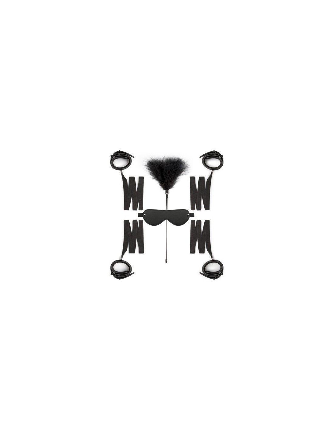 Przygotuj się na niezapomniane chwile pełne podniecenia i przyjemności. Ten zestaw składa się z kajdanek - mankietów do kostek, maski na oczy i podrażniacza. Cztery mankiety są połączone ze sobą, co daje Ci nieograniczone możliwości. Przypnij je do słupków łóżkowych, krzeseł lub uprzęży - wybór należy do Ciebie! Maska na oczy wzmacnia pozostałe zmysły, intensyfikując doznania i zapewniając Ci ekscytujące wrażenia.