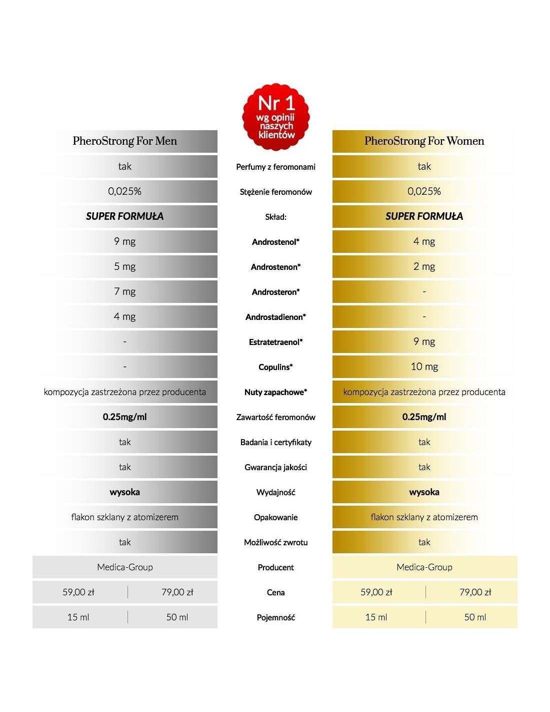 Specjalnie dobrana kompozycja składników zapachowych i feromonów zapewnia efekt synergii i niesamowite działanie już od pierwszego użycia. Pherostrong to nie tylko wabik seksualny, ale także narzędzie, które pozwoli Ci poprawić komunikację w każdej dziedzinie życia społecznego. Dzięki niemu z łatwością nawiążesz nowe kontakty, zbudujesz lepsze relacje i osiągniesz sukces zarówno w życiu prywatnym, jak i zawodowym.