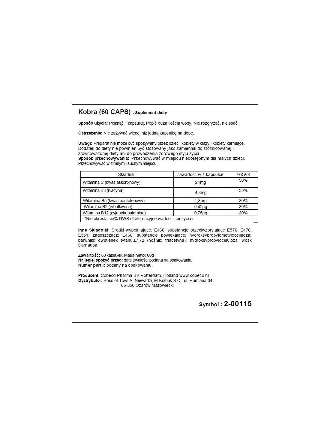 Suplement diety Kobra 60 kaps. to idealne rozwiązanie dla osób poszukujących wsparcia w poprawie metabolizmu energetycznego i zwiększeniu wydolności fizycznej. Dzięki zbilansowanej kombinacji witamin B2, B3, B5, B12 i C, Kobra przyczynia się do prawidłowego funkcjonowania organizmu i dostarcza niezbędnej energii.