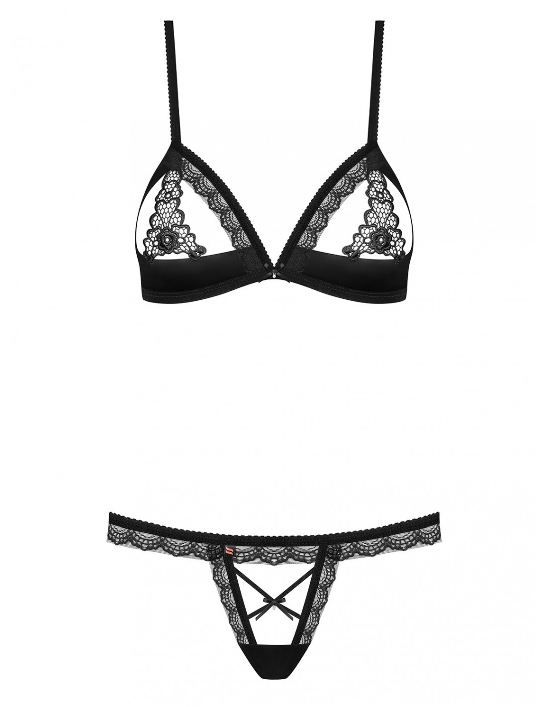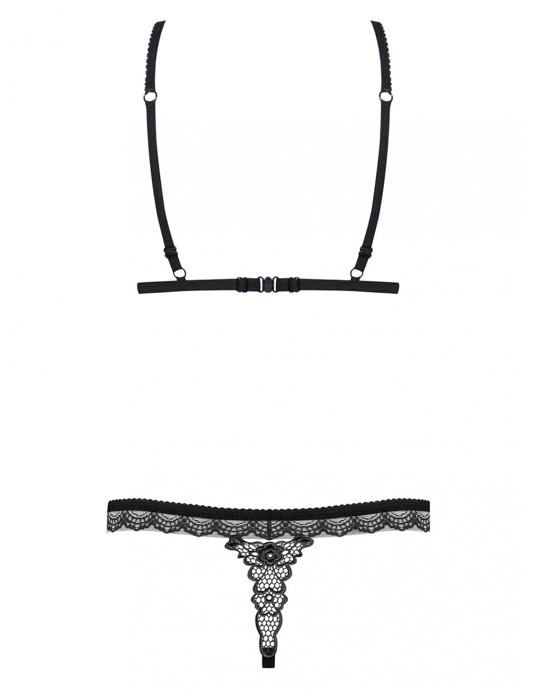 Nasz komplet bielizny erotycznej składa się z dwóch niezwykłych elementów: biustonosza i majteczek. Biustonosz został zaprojektowany w niegrzecznym fasonie, który intryguje podwójnie dzięki nowoczesnym, koronkowym wstawkom. Regulowane ramiączka i zapięcie zapewniają idealne dopasowanie, a otwarte, lekko usztywniane miseczki z koronkową wstawką nadają Twojemu biustowi zjawiskowy wygląd.