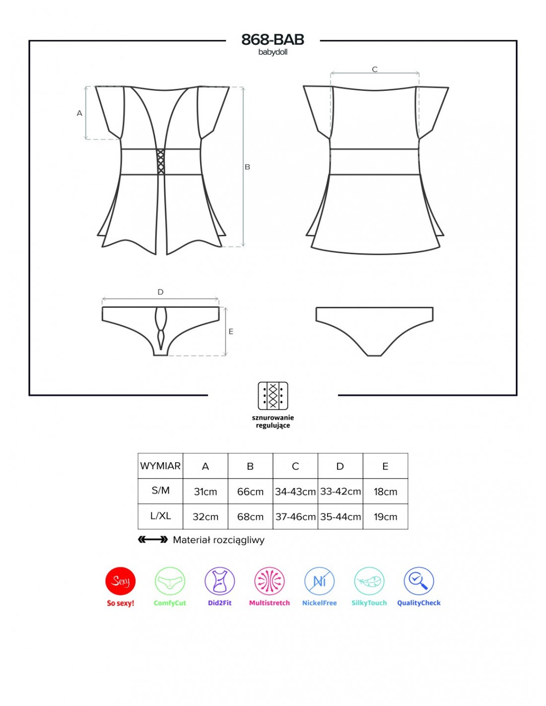 Sznurowanie regulujące pod biustem to nie tylko seksowny motyw, ale także możliwość dopasowania babydoll do swojej figury dzięki innowacyjnemu systemowi Did2Fit. Pas satynowego materiału łączy górę i dół koszulki, a brzegi ozdobione koronką nadają jej jeszcze większej elegancji.