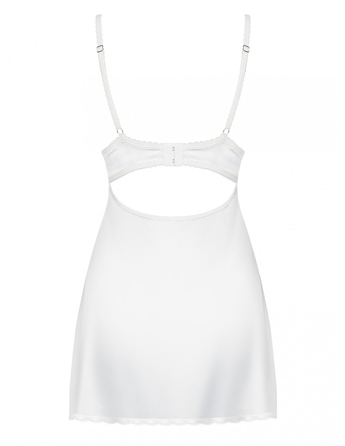 Nasza bielizna nocna to nie tylko wygoda i doskonałe dopasowanie, ale również piękne detale. Beżowe miseczki pokryte satyną i tiulem z ozdobnym haftem nadają biustowi zjawiskowy wygląd, a słodka kokardka i perełka między piersiami dodają jeszcze więcej uroku. Dodatkowo, seksowne wycięcie na plecach sprawia, że całość prezentuje się niezwykle atrakcyjnie.