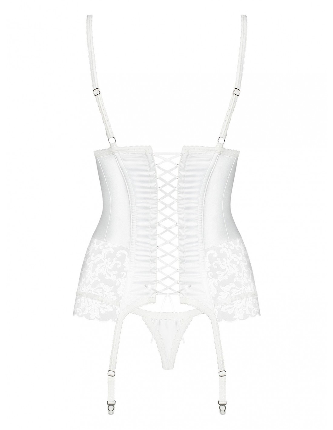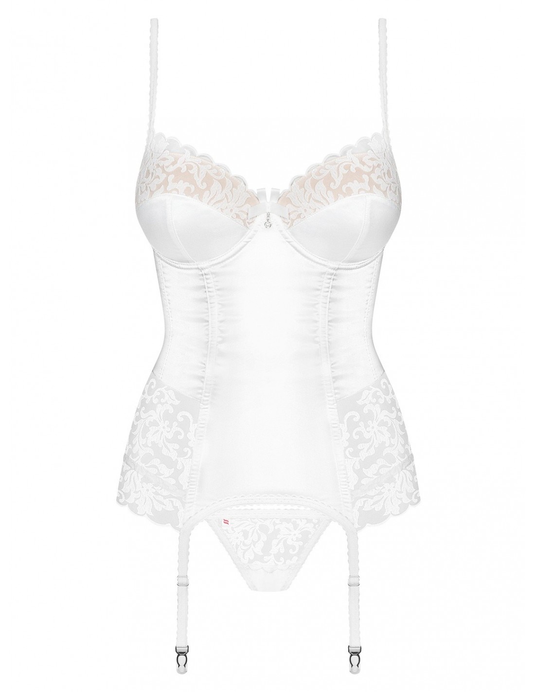 Beżowe miseczki pokryte satyną i tiulem tworzą niezwykle elegancki wygląd, a kokardka i perełka między piersiami dodają zalotnego uroku. Prześwitujący tiul eksponuje bioderka, podkreślając Twoje kobiece kształty. Na lewym boku znajduje się zamek ułatwiający zakładanie i zdejmowanie gorsetu, a sznurowanie regulujące na plecach (Did2Fit) zapewnia seksowny wygląd i idealne dopasowanie. Do gorsetu dołączone są również regulowane paski do pończoch oraz śliczne stringi, które uzupełniają całość tego niezwykłego zestawu.