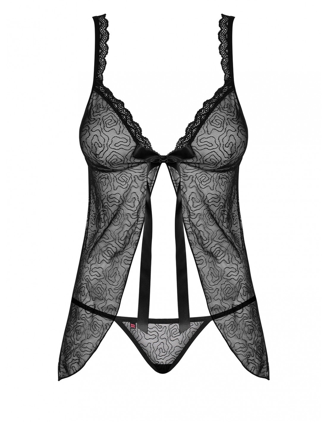 Przepiękna babydoll odsłaniająca brzuszek to tylko jedna z wielu zalet tego wyjątkowego produktu. Została wykonana z prześwitującej siateczki w subtelnym wzorze, która dodaje jej niezwykłego uroku. Regulowane ramiączka zapewniają idealne dopasowanie, a miseczki podszyte beżową siateczką nadają całości jeszcze większej elegancji. Dekolt został ozdobiony koronką, a satynowa kokarda dodaje uroku i podkreśla kobiecy wygląd. W zestawie znajdują się również seksowne stringi, które idealnie komponują się z babydoll. Całość wykonana jest z delikatnego w dotyku i elastycznego materiału, aby zapewnić Ci maksymalny komfort i poczucie luksusu.