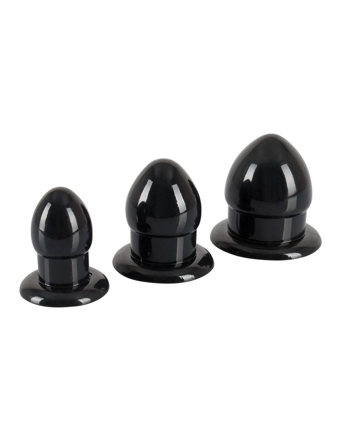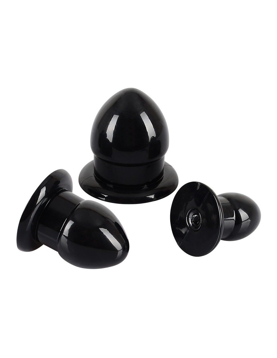 Trzy błyszczące czarne korek analny / zestaw, każdy ze stojakiem / korkiem. Zacznij od małej wtyczki analnej (długość całkowita 5,2 cm) i ciesz się głębokością wstawiania 4,5 cm przy max. Średnica 3 cm w tylnym wejściu i wzrost dzięki środkowej zatyczce (długość całkowita 5,7 cm) i głębokości wkładania 5 cm o średnicy max. 3,9 cm. A jeśli chcesz jeszcze bardziej zwiększyć przyjemność z odbytu, złap największą zatyczkę (długość całkowita 6,2 cm) z głębokością wkładania 5,7 cm i dostojną średnicą max. 4,9 cm.