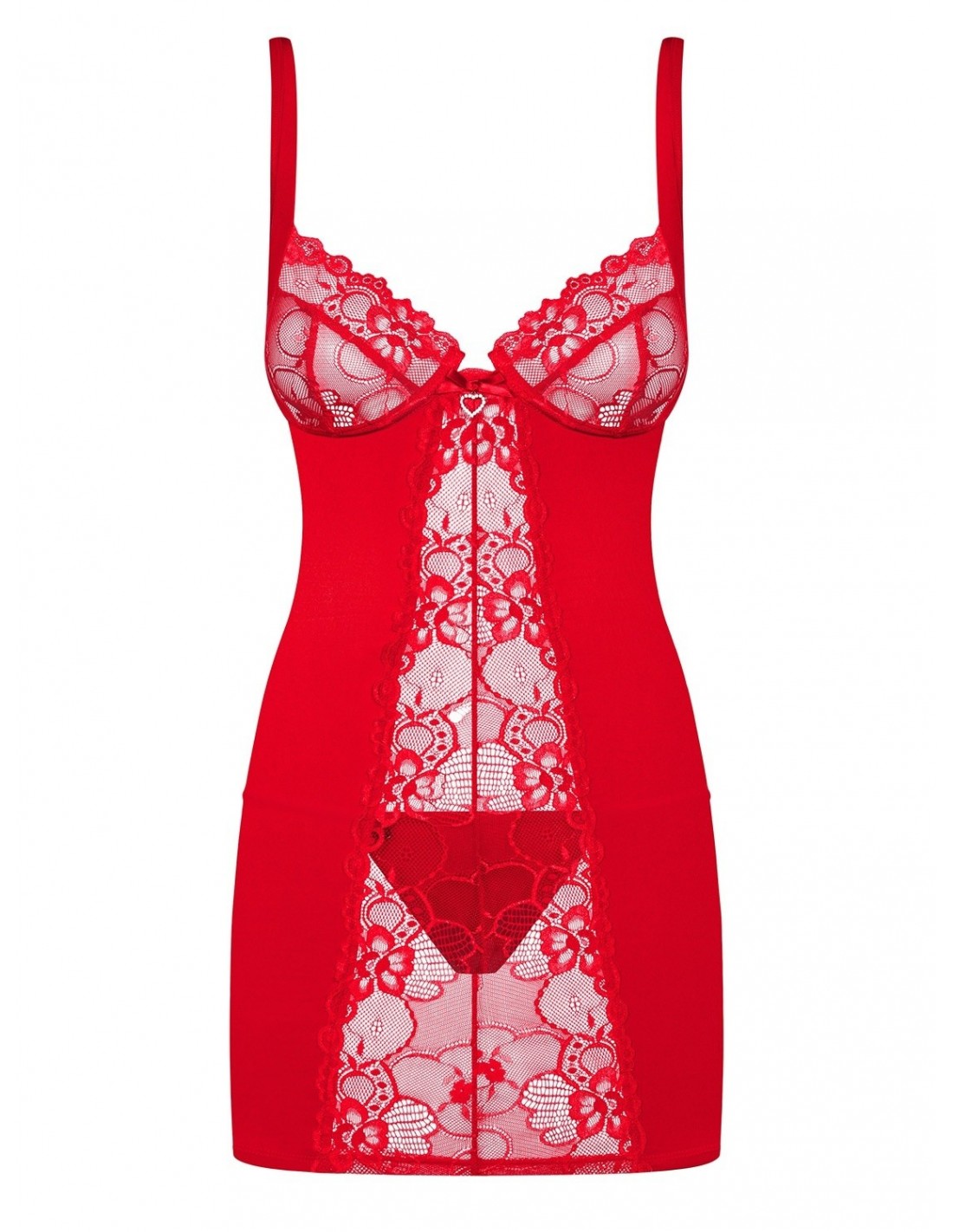 Wyobraź sobie te cudowne chwile spędzone w powalająco uroczej koszulce Heartina. Jej gładka tkanina i koronka pełna kwiatowych zdobień delikatnie otulają Twoje ciało, podkreślając kobiecy wdzięk. Intensywna czerwień rozpala fantazje, a połyskująca zawieszka idealnie wieńczy całość. To niezwykłe połączenie sprawia, że ta bielizna jest nieodparcie kusząca.