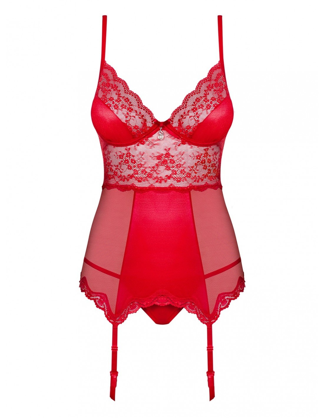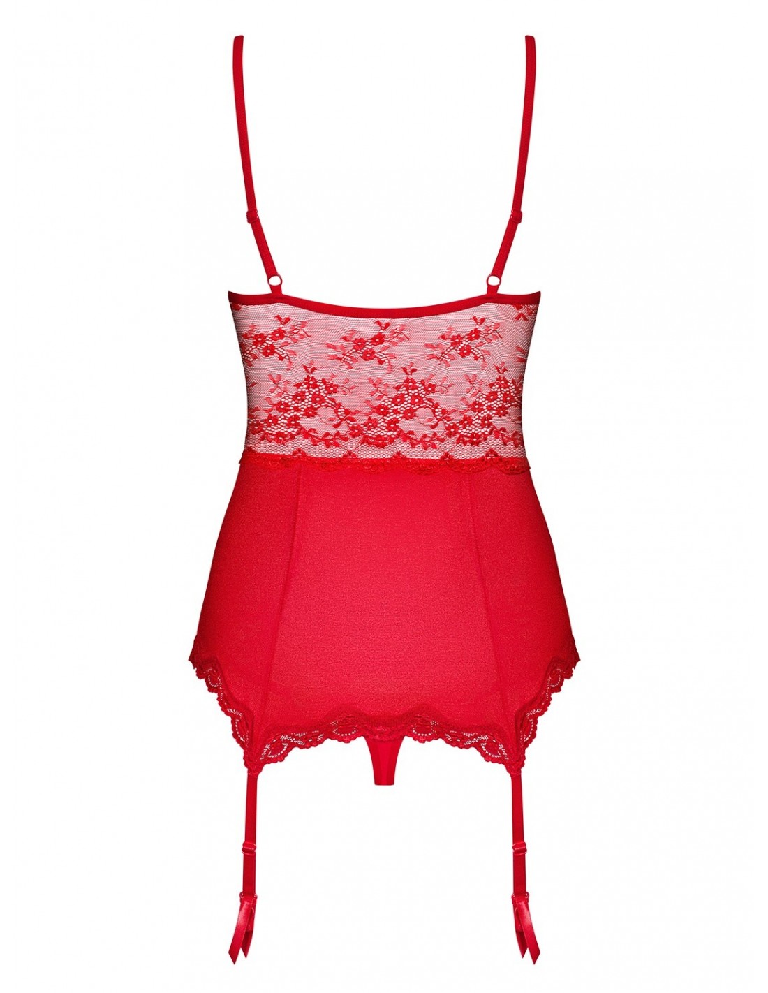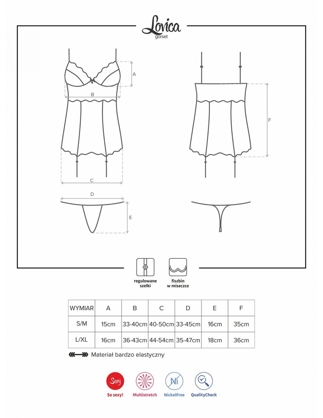 Gorset Lovica jest połączony z regulowanymi paskami do pończoch, co pozwala na stworzenie kompletnego, uwodzicielskiego looku. W komplecie znajdują się również pasujące do całości stringi, które doskonale komponują się z gorsetem, tworząc spójną i zmysłową całość.