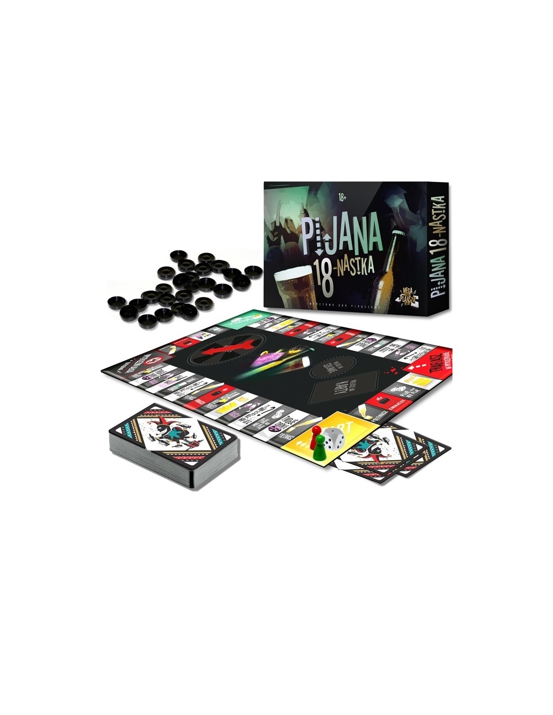 Pijana Osiemnastka to nie tylko plansza i karty. Zestaw zawiera również 36 monet, ruletkę, pionki i kostkę. Dzięki nim Twoja impreza nabierze jeszcze większego rozmachu. Zbierz ekipę, napełnij szkło i zacznijcie przygodę pełną śmiechu, zabawy i niezapomnianych wspomnień!