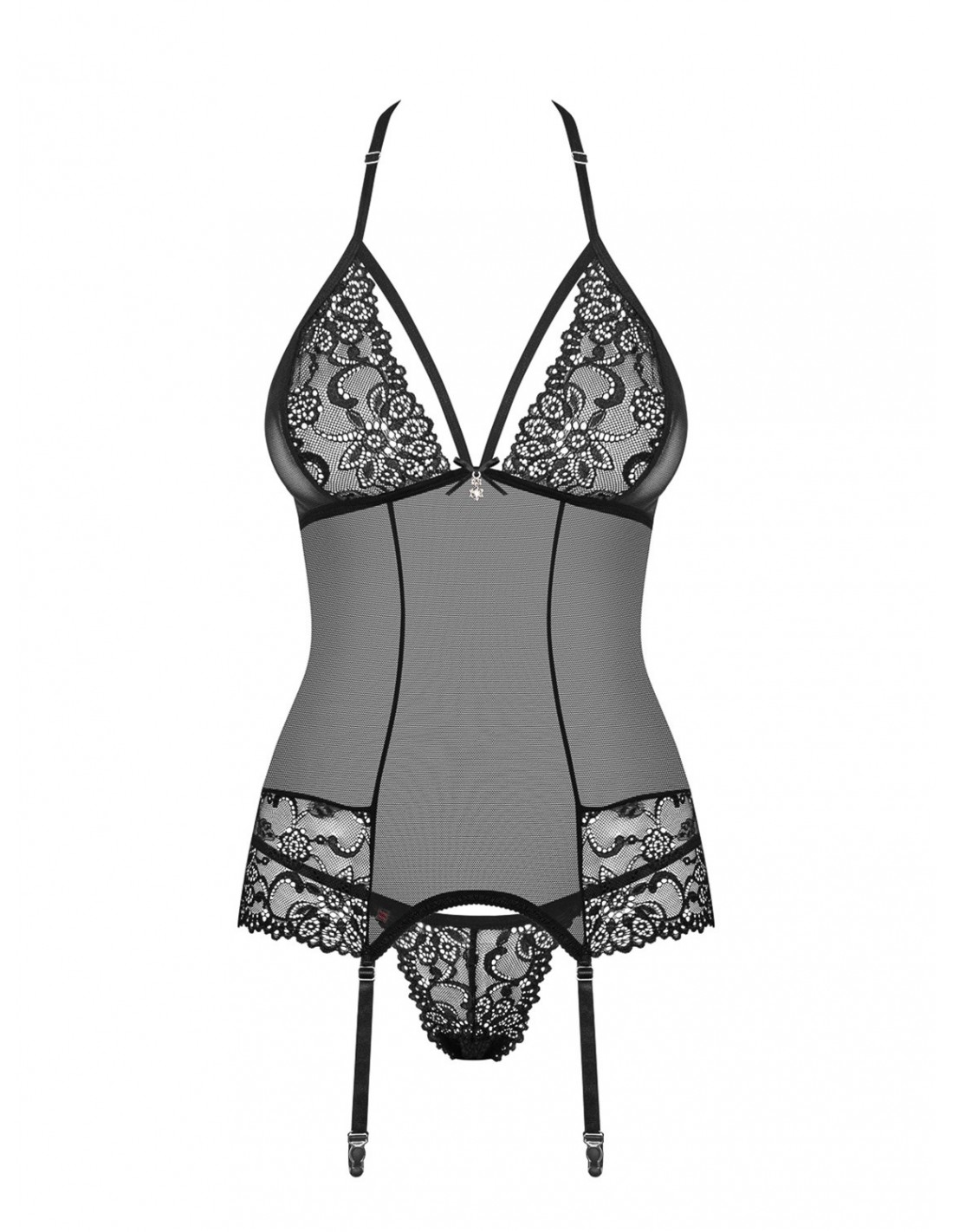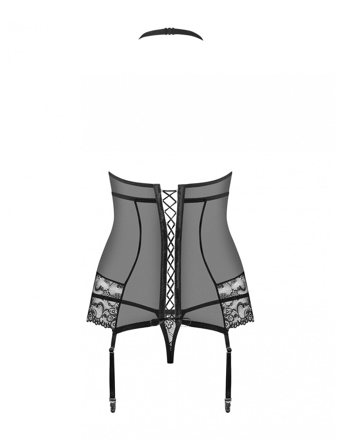 Gorset 838-Cor-1 posiada sznurowanie na plecach, które gwarantuje idealne dopasowanie (Did2Fit) i jednocześnie nadaje mu zmysłowego wyglądu. Zapięcie na szyi odkrywa plecy, dodając całości jeszcze więcej seksapilu. Regulowane ramiączka i paski do pończoch pozwalają dostosować gorset do swoich preferencji. Dodatkowo, biżuteryjna zawieszka dodaje mu elegancji i wyjątkowości.