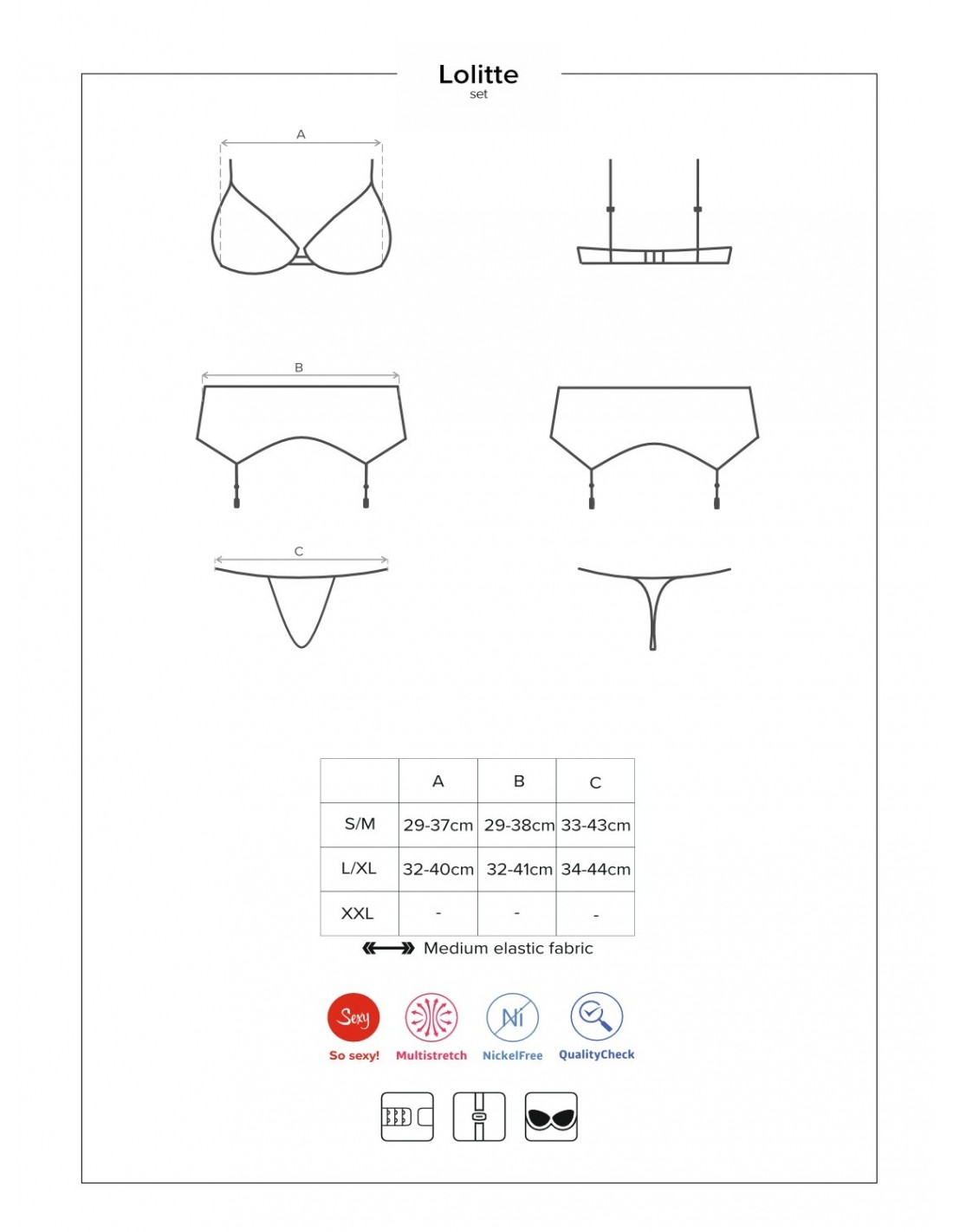 Przedstawiamy Ci niezwykły Komplet Bielizny Lolitte 3-Częściowy w kolorze czarnym, stworzony przez renomowanego producenta Obsessive. Ten ekskluzywny zestaw bielizny erotycznej jest idealny dla kobiet, które pragną poczuć się wyjątkowo i uwodzić swoim wyglądem.