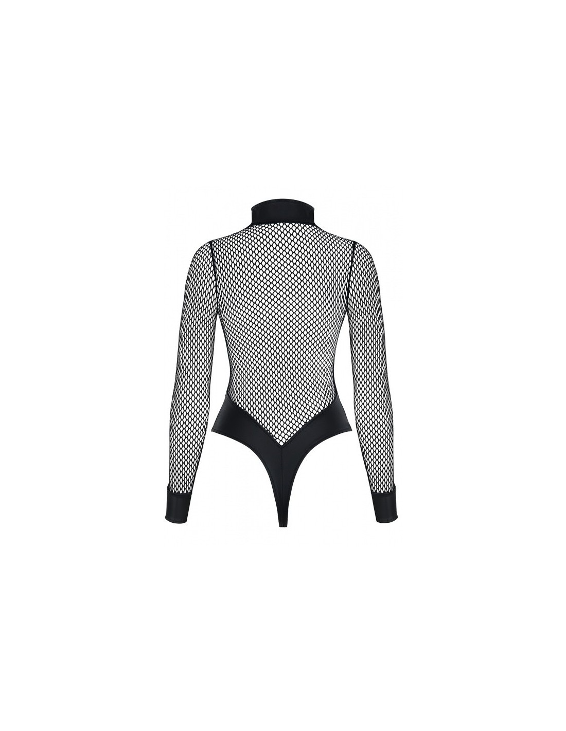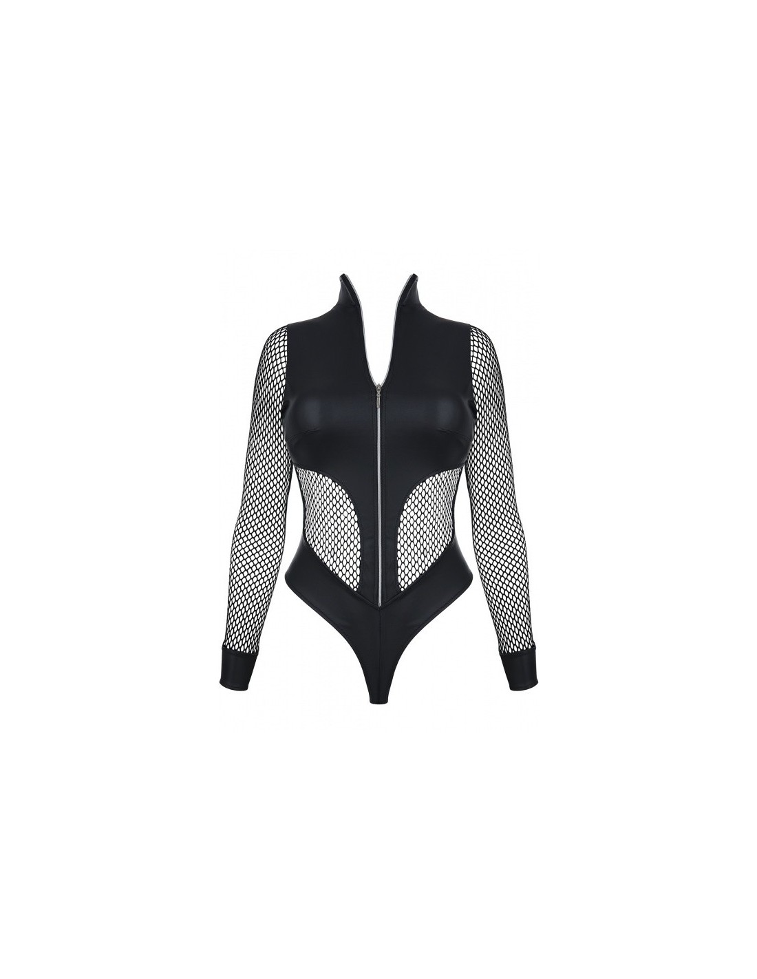 Body ze stójką przy szyi i długim srebrnym ekspresem z ozdobnym suwakiem to nie tylko piękny dodatek, ale także praktyczne rozwiązanie. Rozsuwany suwak przyjemnie umili każdą chwilę, dając dużo przyjemności z prowokacyjnych zabaw. Długie rękawy z czarnej siateczki u dołu wykończone czarną ekoskórą dodają całości elegancji i subtelności. Z tyłu czarny materiał efektownie prezentuje się na pośladkach, podkreślając ich okrągły kształt.