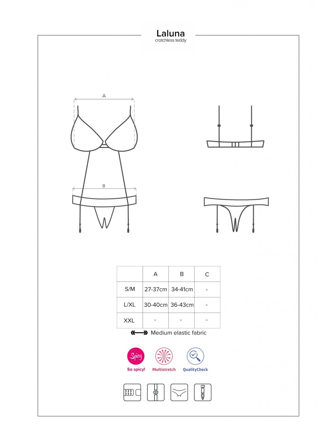 Czy jesteś gotowa na szczyptę szaleństwa w sypialni? Body Laluna posiada otwarty krok, który podkręca temperaturę i dodaje pikanterii Twoim intymnym chwilom. Dodatkowo, paski do pończoch są odpinane, co daje Ci możliwość dopasowania ich do swojego gustu. Pamiętaj, że pończochy nie są częścią zestawu, ale model Laluna idealnie się z nimi komponuje.