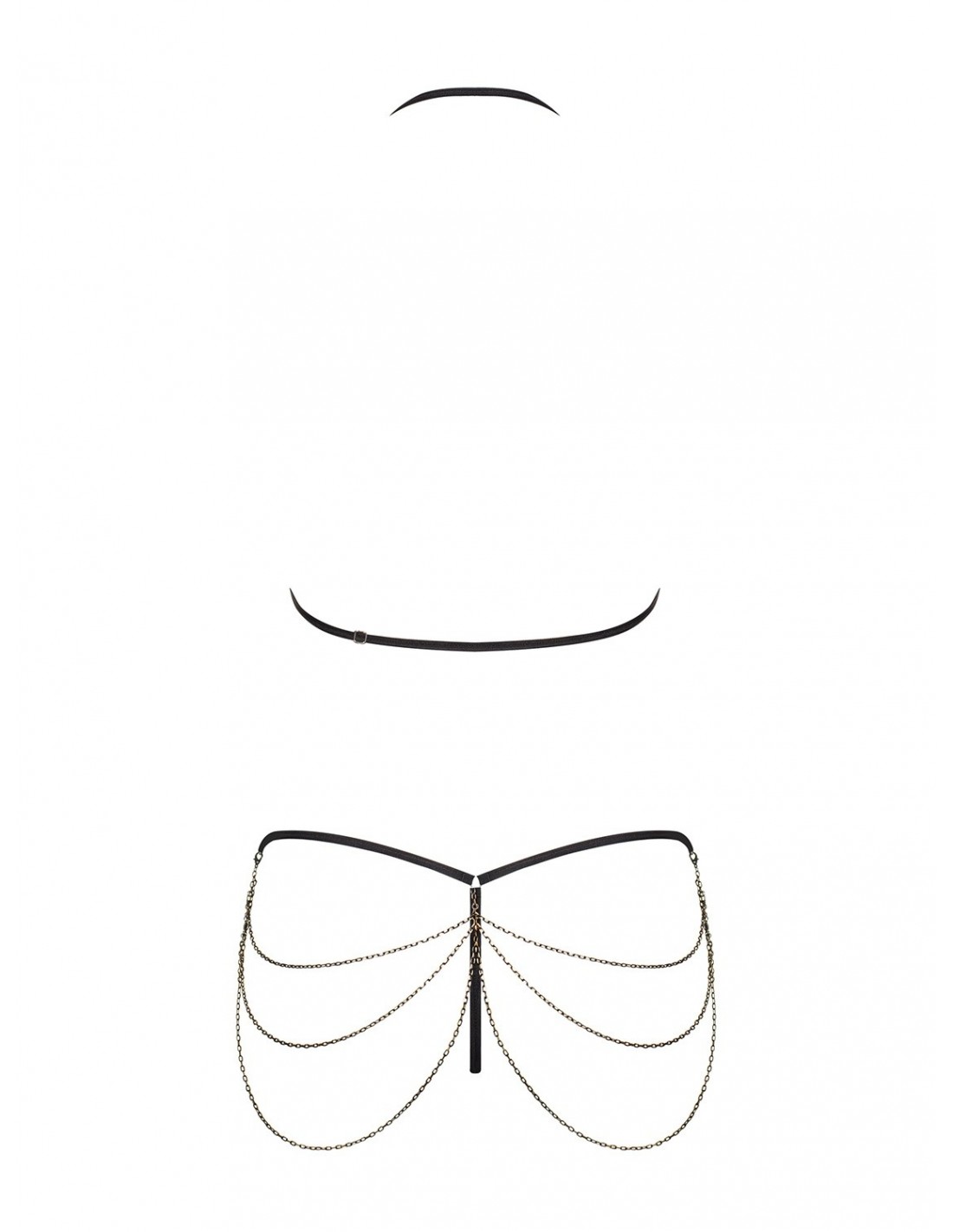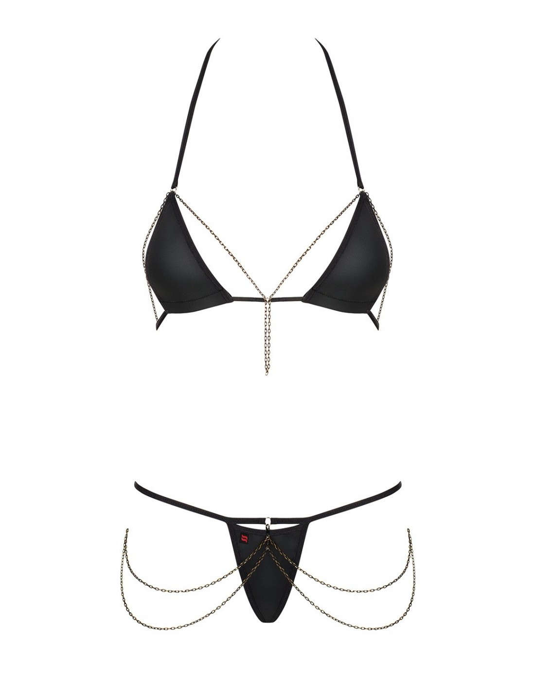 Biustonosz w tym zestawie został wyposażony w ramiączko na szyję, które dodaje mu jeszcze więcej seksapilu. Dzięki rozwiązaniu Did2Fit możesz go w pełni regulować, co gwarantuje idealne dopasowanie do Twojego ciała. Komplet zawiera również stringi, które dopełniają całość, oraz unikatowe łańcuszki, które dodają mu jeszcze więcej uroku.