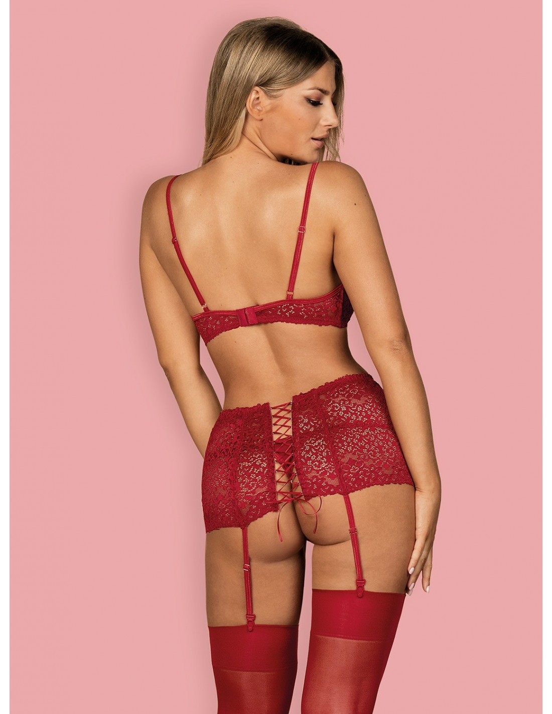 Wiązanie na pośladkach to tylko jeden z wielu seksownych elementów tego kompleciku. Kuszące sznurowanie pasa do pończoch dodaje mu niepowtarzalnego uroku, a koronkowy wzór sprawia, że wyglądasz niezwykle kobieco i uwodzicielsko.