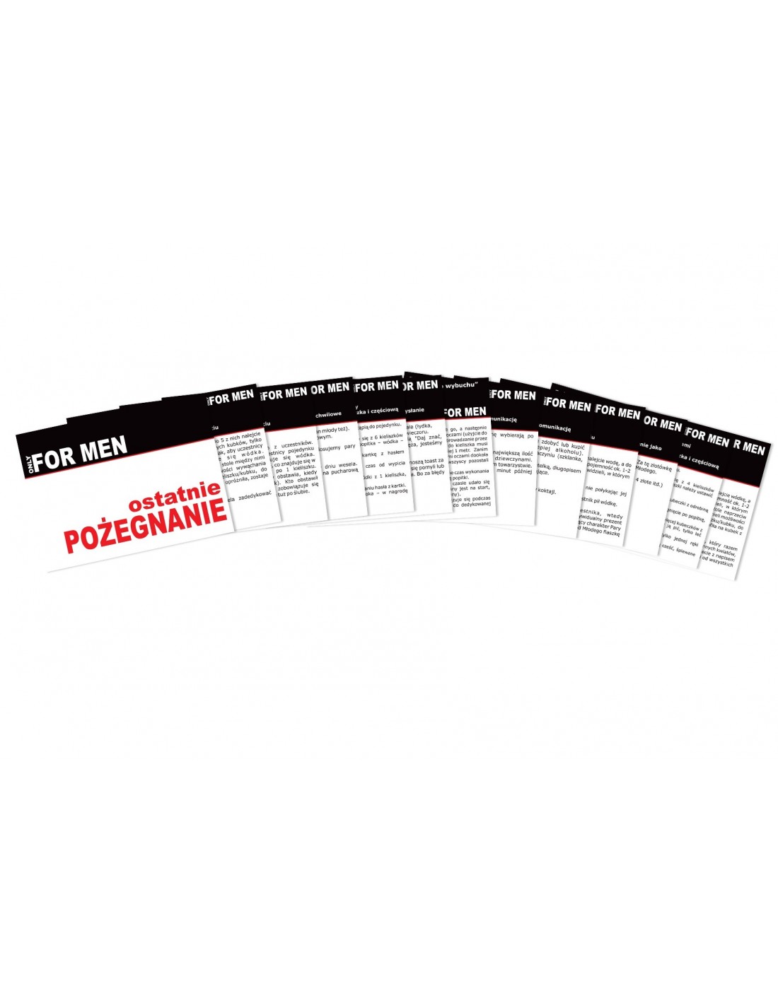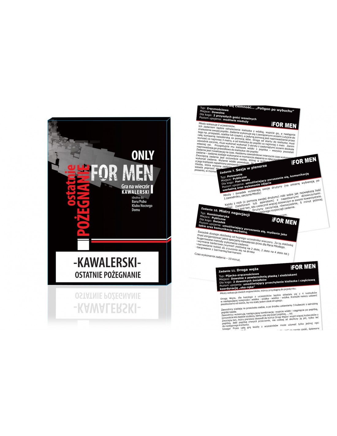W paczce znajdziecie 12 odlotowych zadań, które angażują wszystkich uczestników wieczoru kawalerskiego. Te wyzwania są zbudowane w oparciu o trzy elementy, które każdy facet uwielbia: wódkę, kobiety i sport. Dlaczego tylko 12 zadań? Bo to idealna liczba, która pozwoli wam przeżyć wieczór pełen radości i śmiechu.