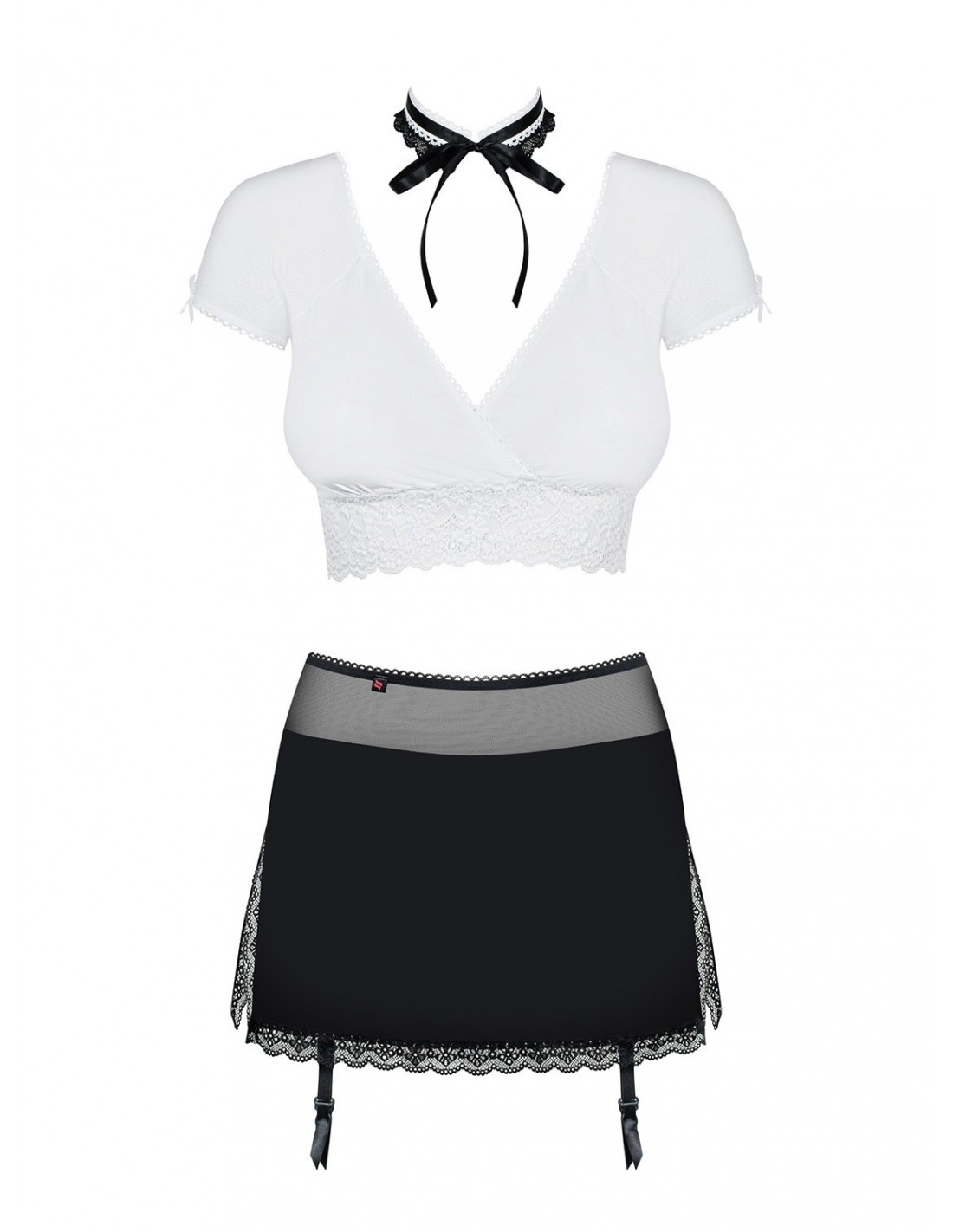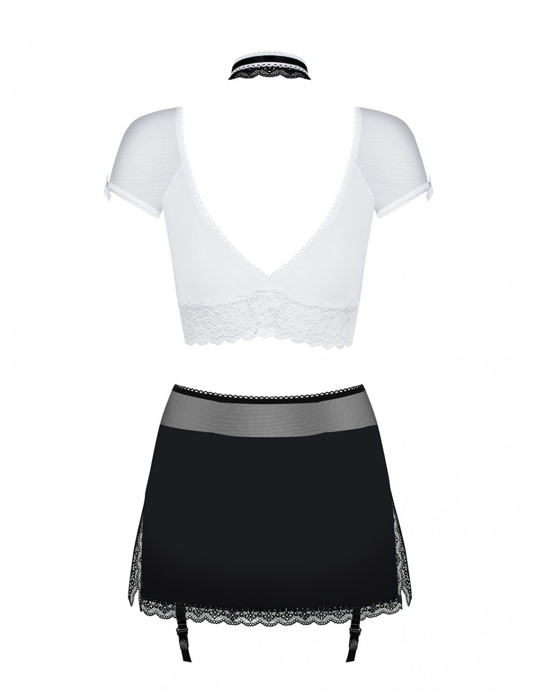 Ten niezwykły kostium składa się z kilku elementów, które podkreślą Twoje atuty i sprawią, że poczujesz się niezwykle atrakcyjnie. Biała koszulka z dekoltem i koronkowym wykończeniem pięknie podkreśla biust, dodając Ci pewności siebie i seksapilu. Krótka, czarna spódniczka optycznie wysmukla biodra i dodaje Ci zmysłowości. Stringi z odpinanymi paskami do pończoch to pikantny element zestawu, który podkręci temperaturę i sprawi, że poczujesz się niezwykle uwodzicielsko. Nie zapomnij o frywolnym kołnierzyku z kokardką, który dodaje całości uroku i fantazji.