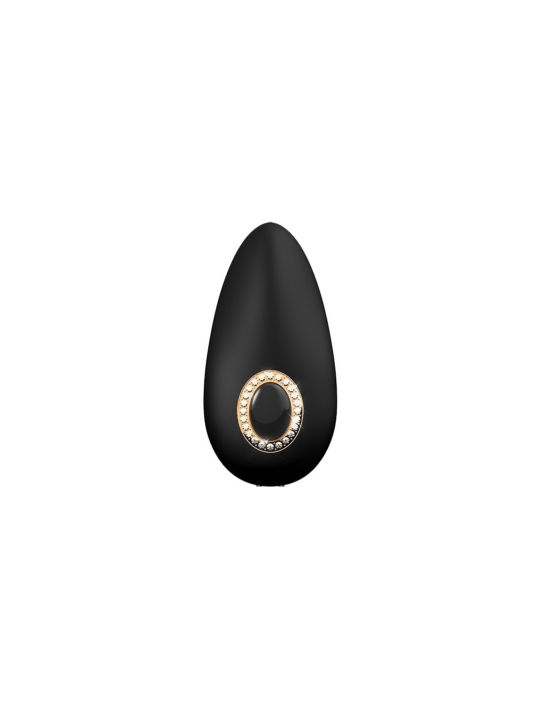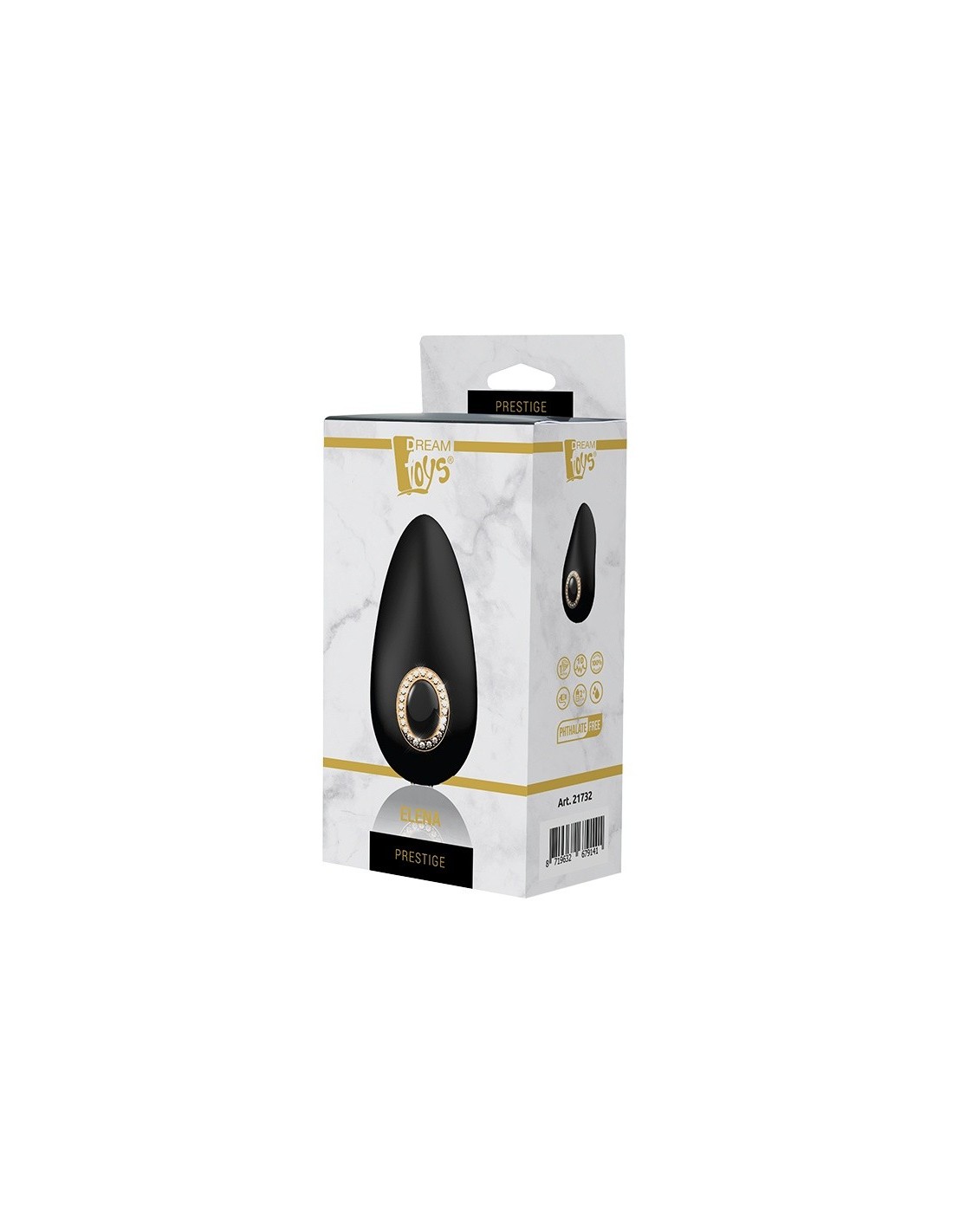 Stymulator Elena layon z kolekcji Prestige firmy Dream Toys to czarny stymulator ze stylowym guzikiem w kształcie klejnotu w złotym pierścieniu. Zaokrąglony kształt i gładkie wycięcie przenoszą silne wibracje na łechtaczkę. Elena ma mocny silnik, który oferuje 7 wzorów wibracji i 3 prędkości. Stymulator Elena można ładować za pomocą dołączonego magnetycznego kabla USB. Wykonany jest z miękkiego silikonu i ABS, wodoodporny i bezpieczny dla ciała, nie zawiera ftalanów ani lateksu. Obsługę można wykonać za pomocą jednego przycisku jednodotykowego, który po aktywacji świeci niebieskim światłem LED.