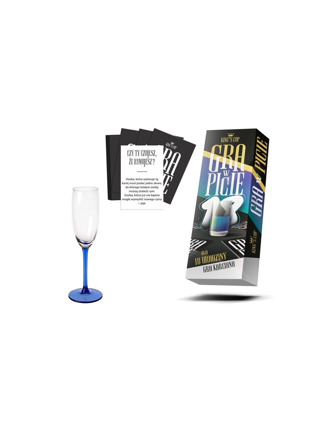 King's Cup - Gra w picie - Osiemnastka to nie tylko standardowy zestaw kart. W komplecie znajdziesz również Kieliszek Króla Gry oraz propozycje zadań związanych z tematem gry. To oznacza, że możesz dostosować rozgrywkę do swoich preferencji i urozmaicić ją własnymi zadaniami. Nawet po kilku partiach gra się nie nudzi, a wraz z każdym kolejnym piciem, przyjemne szumienie w głowach staje się coraz bardziej intensywne!