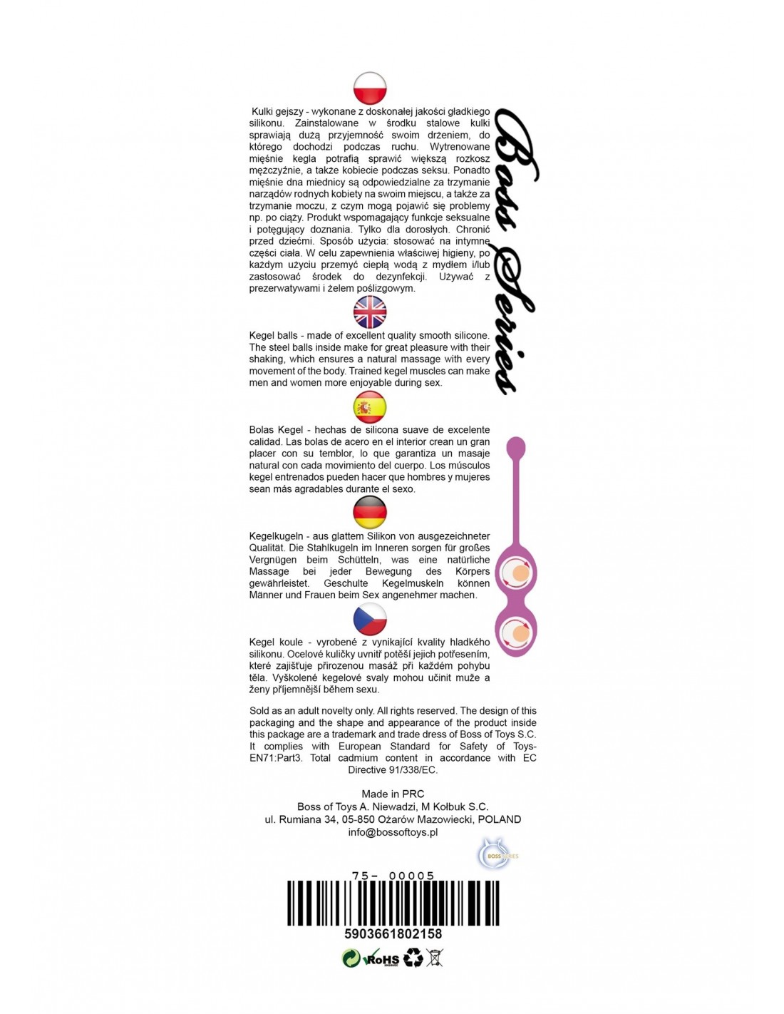 Do produkcji gadżetów i akcesoriów erotycznych marki Boss Series wykorzystuje się wyłącznie materiały najwyższej jakości, gwarantujące pełne bezpieczeństwo użytkownika, wolne od ftalanów i łatwe w utrzymaniu w czystości. Wszystkie produkty tej marki zgodne są z europejskimi normami dla bezpieczeństwa zabawek erotycznych - EN71:Art3.